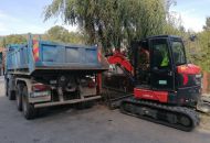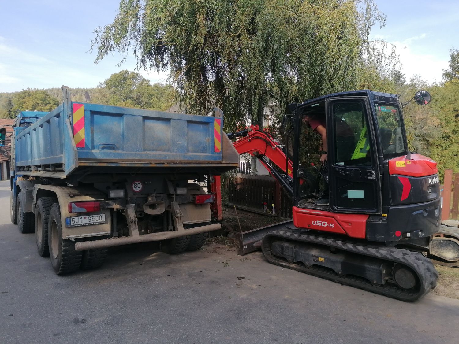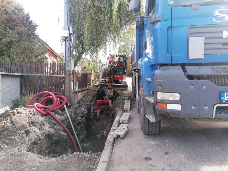 Práce na stavbě chodníku v Dolních Radslavicích začaly tento týden výkopem pro kanalizaci. Jejich zahájení zpozdila změna projektové dokumentace.