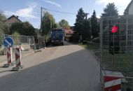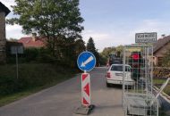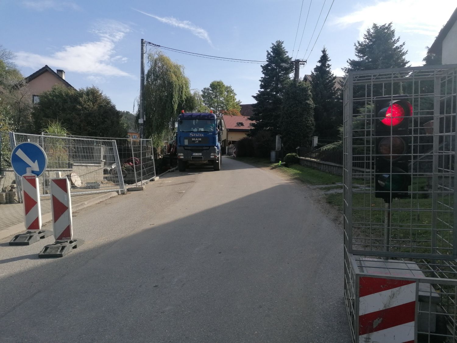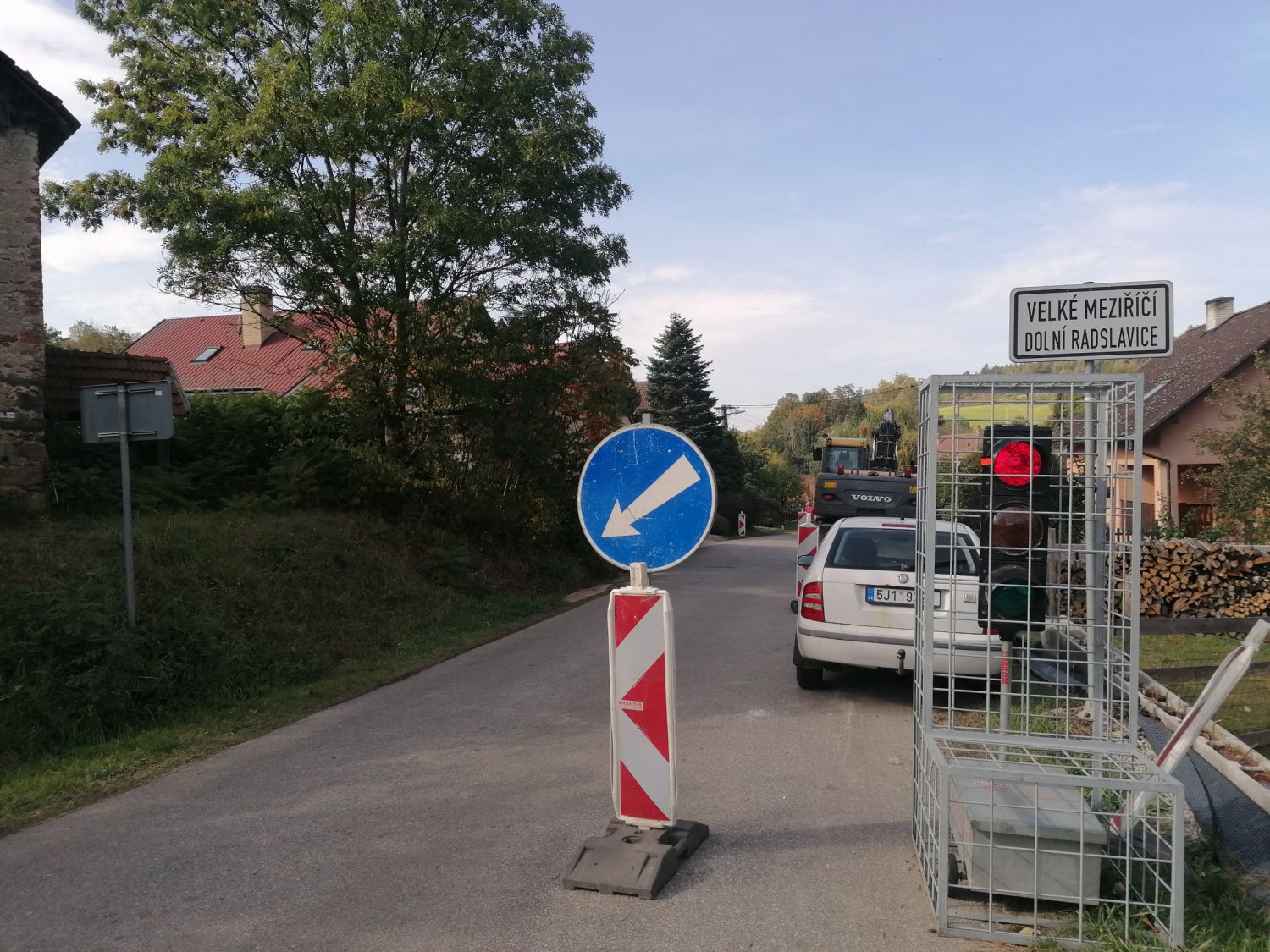 Výstavba chodníku při výjezdu z Dolních Radslavic na Březejc (od domu č. p. 35 po dům č. p. 36) zahrnuje i odvodnění komunikace a přeložení optických kabelů. Vozovka je v místě prací zúžená na jeden jízdní pruh a provoz řízen semafory.