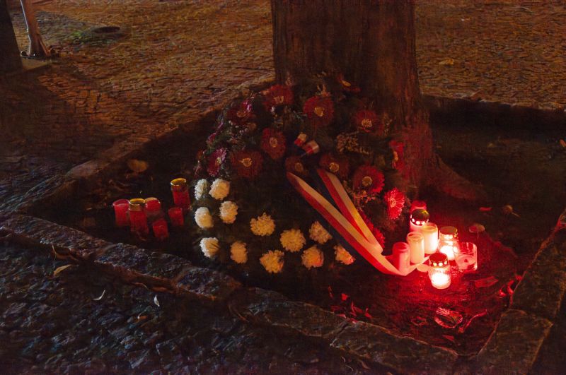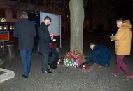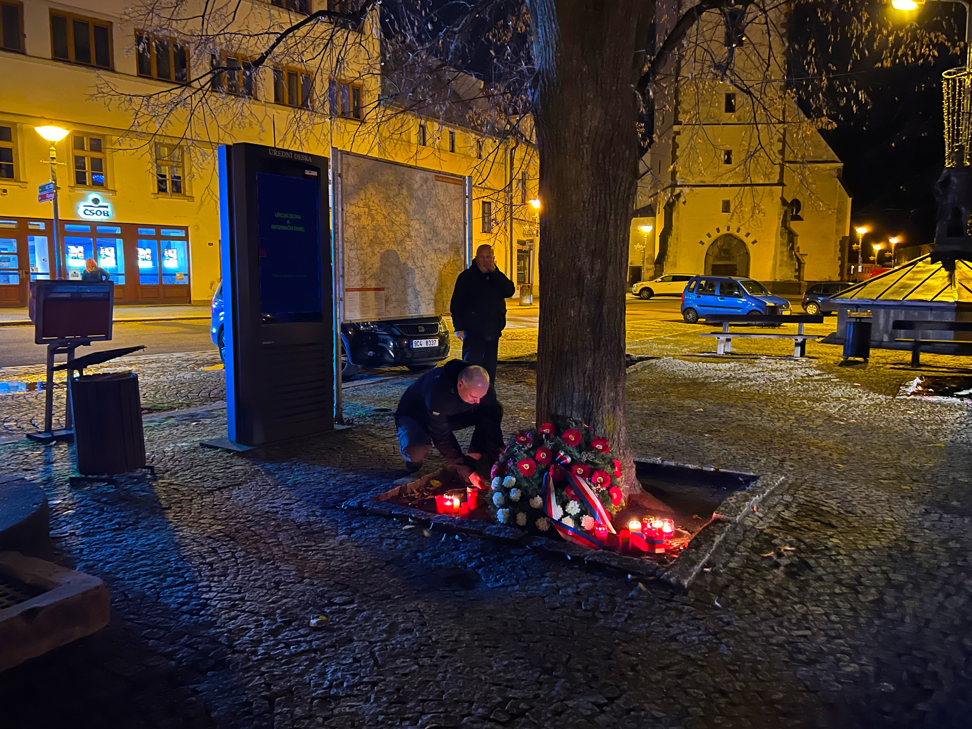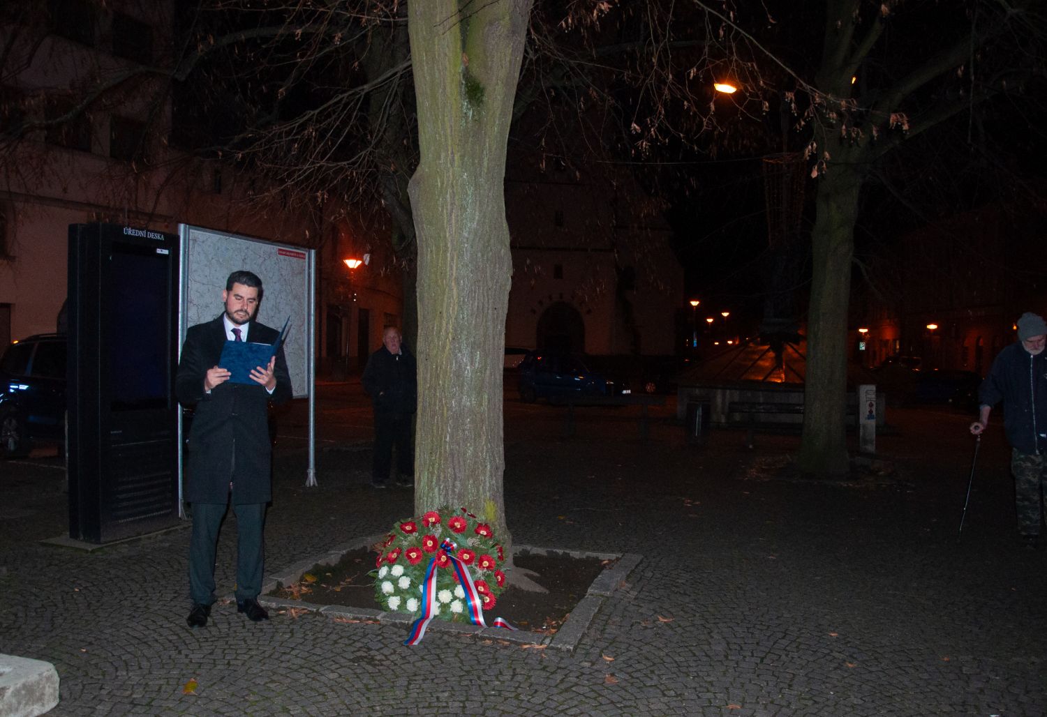O půl sedmé večer, na kdy byl avizován sraz, kladli pod lípu vzpomínkový věnec za město starosta společně s místostarostou. Starosta vyjádřil všem přítomným svou vděčnost za účast a upozornil, jak důležité je na takové události nezapomínat. Následně je vyzval ke tradičnímu zapálení svíček a položení pod lípu svobody.