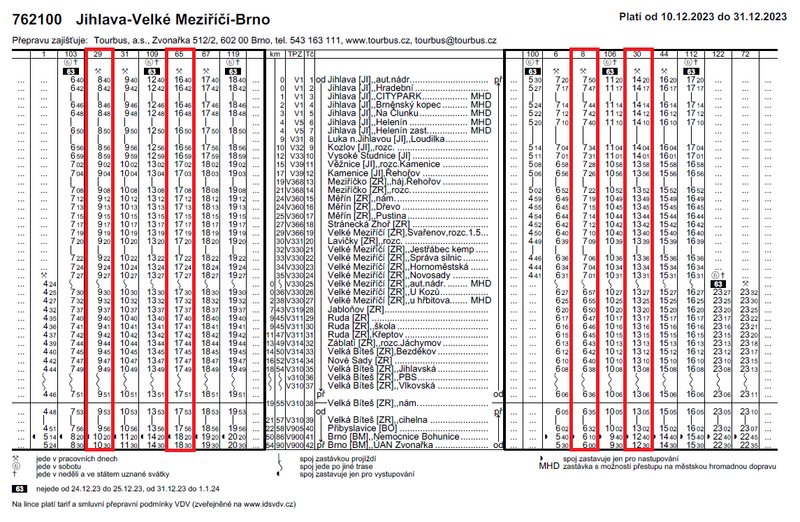 Z důvodu vysoké nemocnosti řidičů dopravce Tourbus mimořádně neodjedou zítra a pozítří (ve čtvrtek 21. 12. a v pátek 22. 12.) následující spoje autobusové linky 762100 Jihlava – Měřín – Velké Meziříčí – Velká Bíteš – Brno.