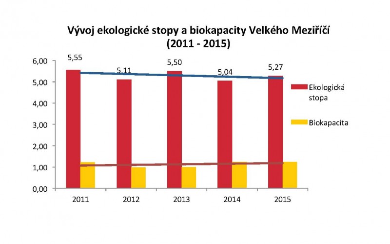 „Město Velké Meziříčí jako jediné v České republice sleduje tento ekologický ukazatel každoročně již od roku 2011. Má tak ze všech českých a moravských měst nejdelší časovou řadu dat o svém ‚ekologickém provozu‘,“ sdělil Třebický s tím, že jeho výsledky jsou příznivé. Ekologická stopa města neroste, přestože se Velké Meziříčí rozvíjí. „Meziročně (2014/2015) se sice mírně zvýšila, v roce 2015 má 5,3 globálního hektaru na obyvatele, avšak celkově od počátku sledování klesá. Tento výsledek je příznivý i ve srovnání s jinými městy v ČR,“ vysvětlil ekolog s tím, že ekologická stopa města převyšuje jeho biokapacitu pouze 4,3krát.