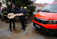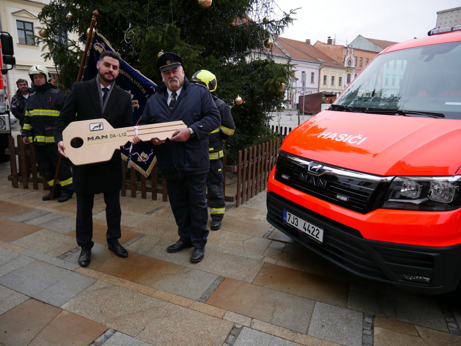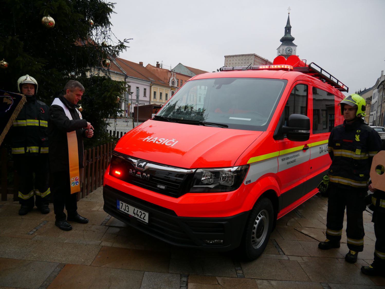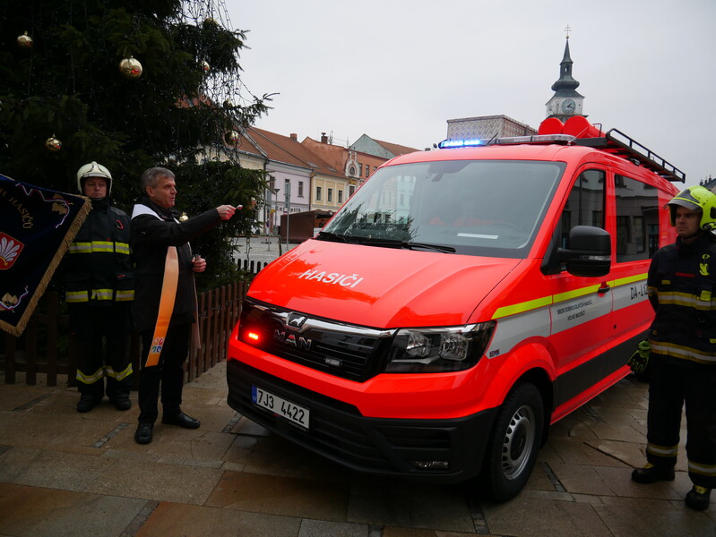 Starosta poté převzal od zástupce firmy Embefor v Kuřimi, která provedla přestavbu vozidla, symbolický klíč od vozu, který obratem předal velkomeziříčským hasičům, konkrétně veliteli výjezdové jednotky Jaroslavu Šišpelovi. Pak dostal slovo děkan Jiří Kaňa, který žehnání hasičského automobilu netradičně zahájil hrou na flétnu a poté provedl akt samotného žehnání.