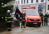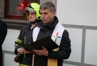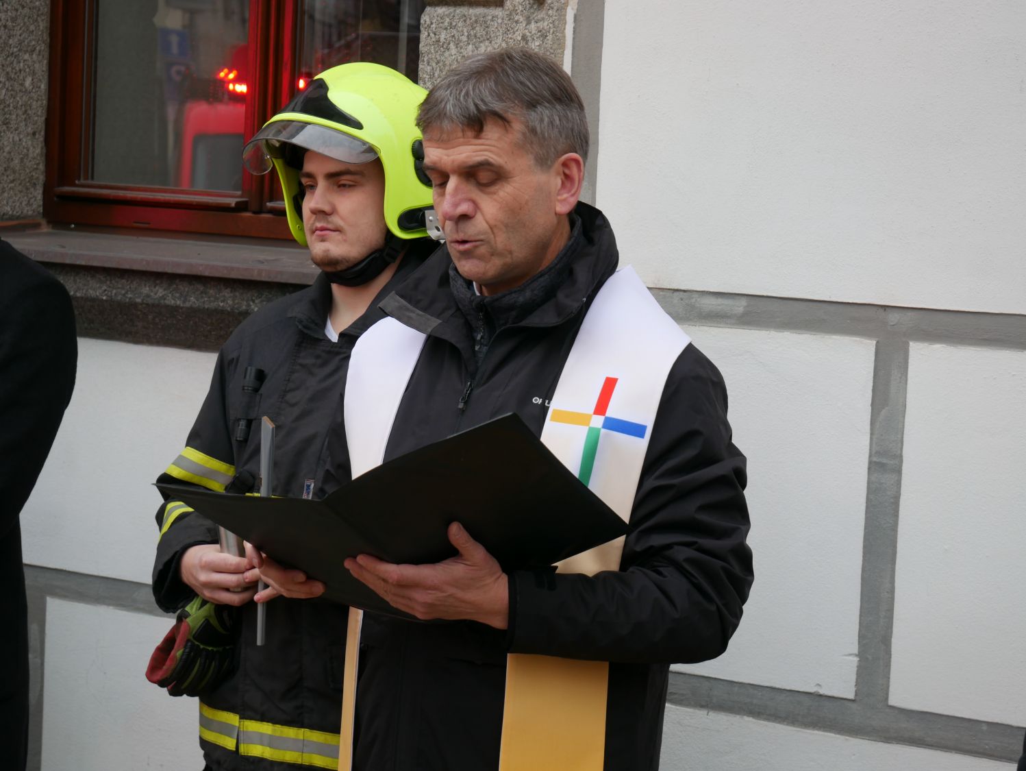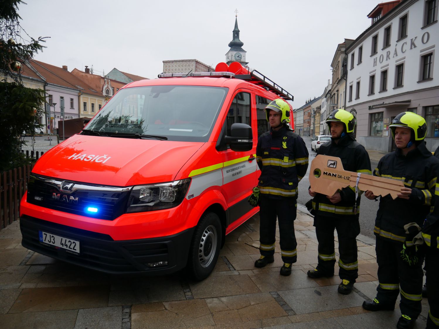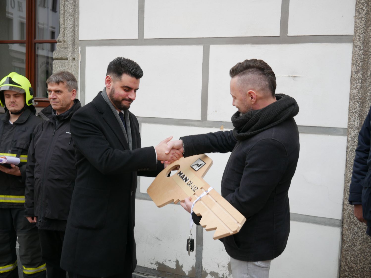 Starosta poté převzal od zástupce firmy Embefor v Kuřimi, která provedla přestavbu vozidla, symbolický klíč od vozu, který obratem předal velkomeziříčským hasičům, konkrétně veliteli výjezdové jednotky Jaroslavu Šišpelovi. Pak dostal slovo děkan Jiří Kaňa, který žehnání hasičského automobilu netradičně zahájil hrou na flétnu a poté provedl akt samotného žehnání.