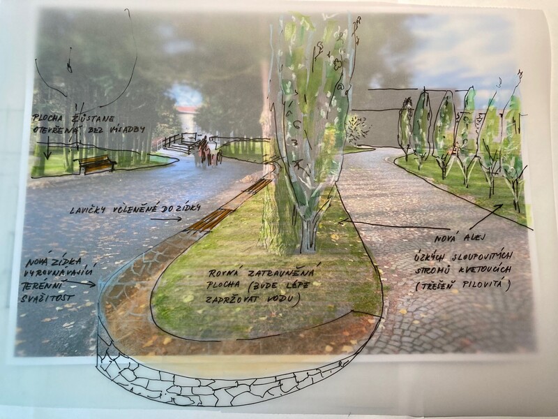 Pravá strana (opět při pohledu od brány) současné aleje nahrazena nebude. Otevře se tu totiž velmi zajímavý a příjemný výhled do prostoru, kterému dominují vzrostlé lípy.