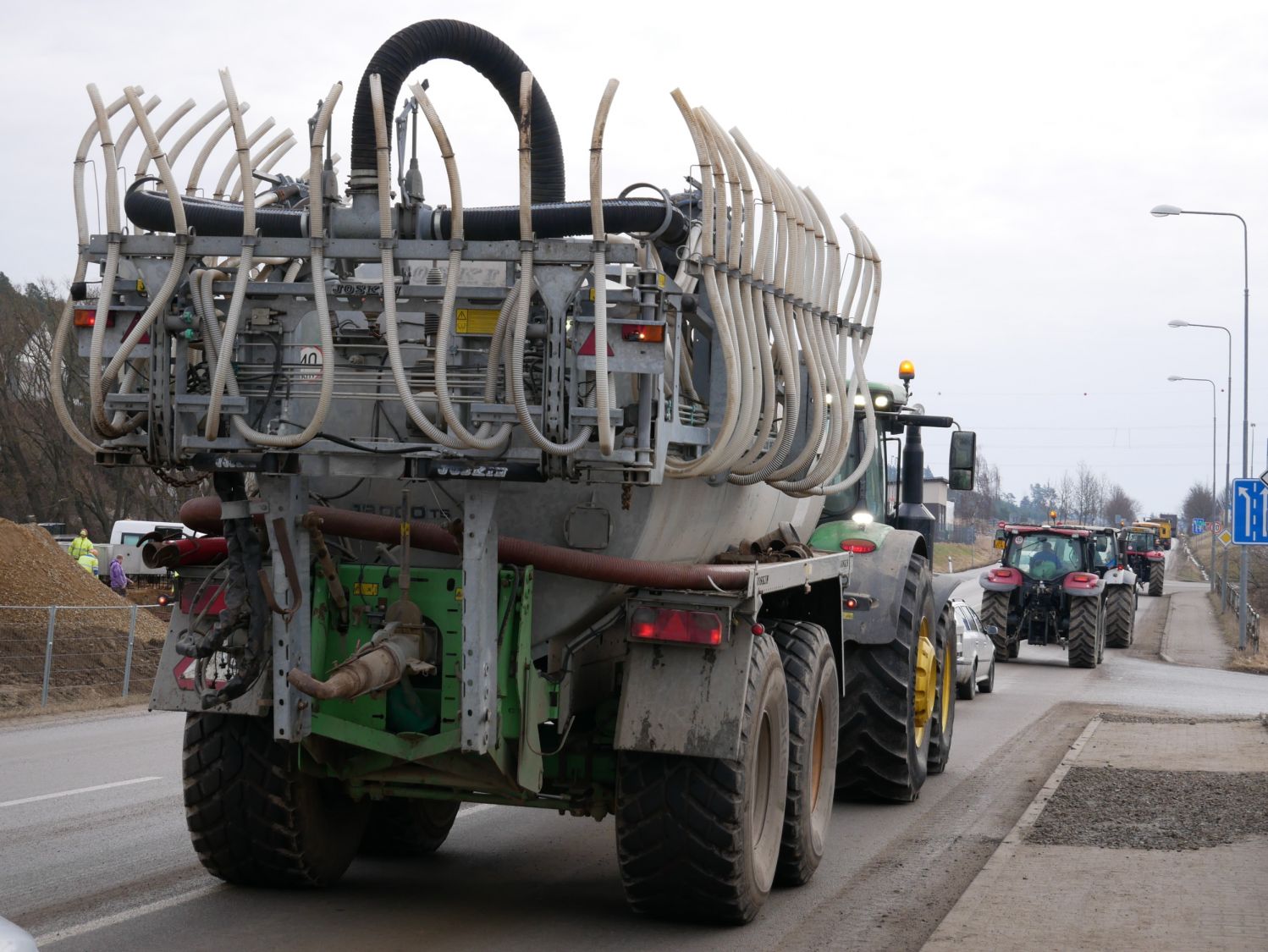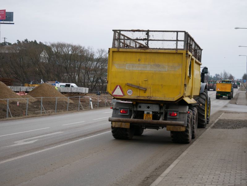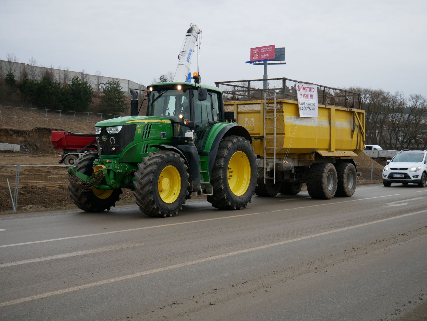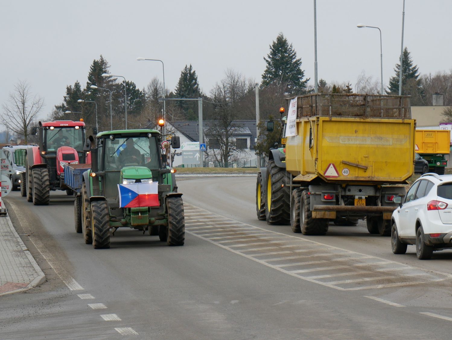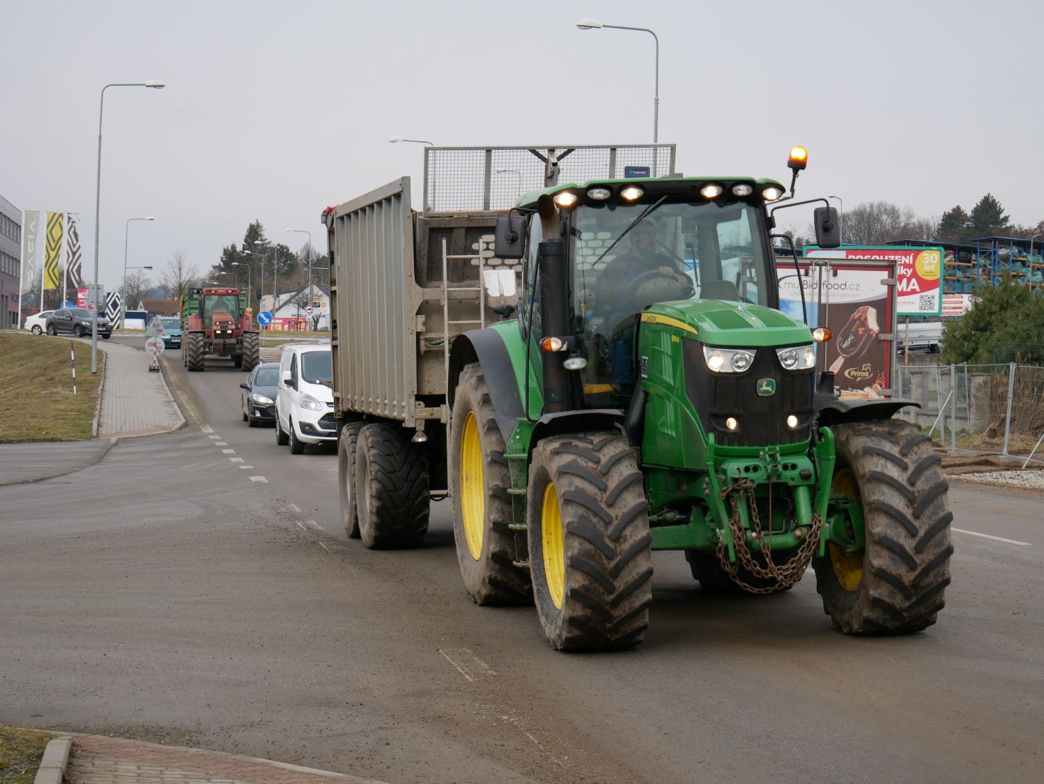Krátce po desáté hodině dopolední se na horizontu silnice II/602 ve směru od Jabloňova objevilo čelo kolony zemědělské techniky. Kolona pomalu přijížděla k městu, projela po kruhovém objezdu nahoře na Karlově a pomalou jízdou se vracela zpět na Jabloňov. Během průjezdu houstla v tomto úseku doprava, ale k nějakým vážnějším incidentům nedocházelo. Část řidičů osobních auto či kamionů se sice tvářila naštvaně, druhá část ovšem zemědělce zdravila a vyjadřovala jim podporu.