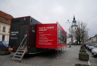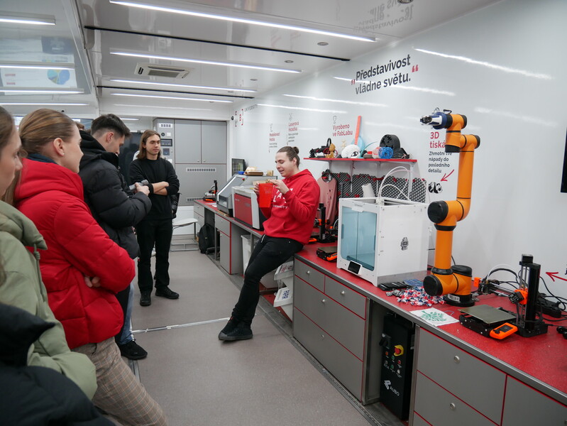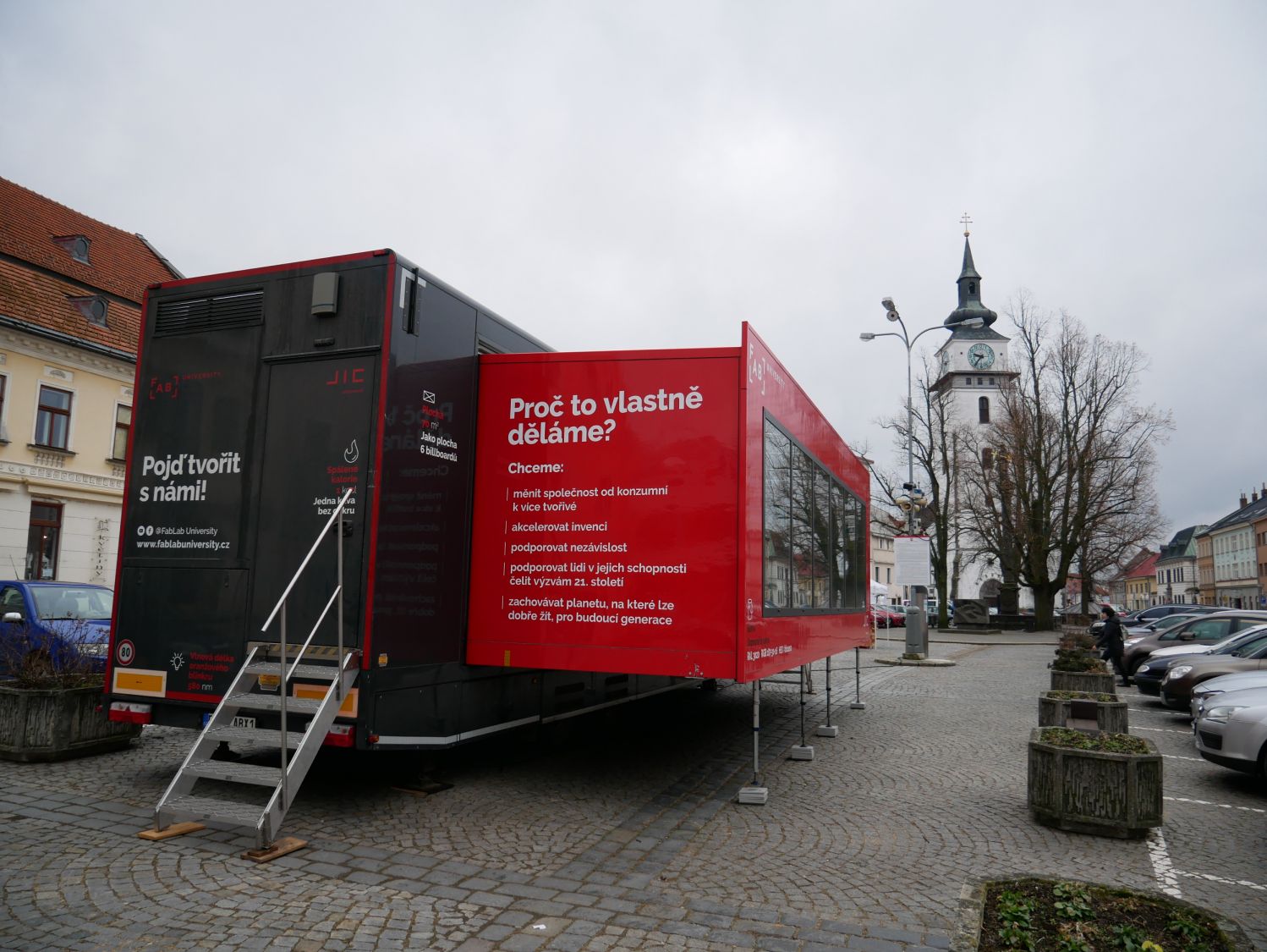Speciálně upravený návěs, vybavený laserovou řezačkou, 3D tiskárnami, robotickým ramenem a dalšími pro mnohé futuristickými přístroji, přijel v pondělí 26. února na náměstí ve Velkém Meziříčí.