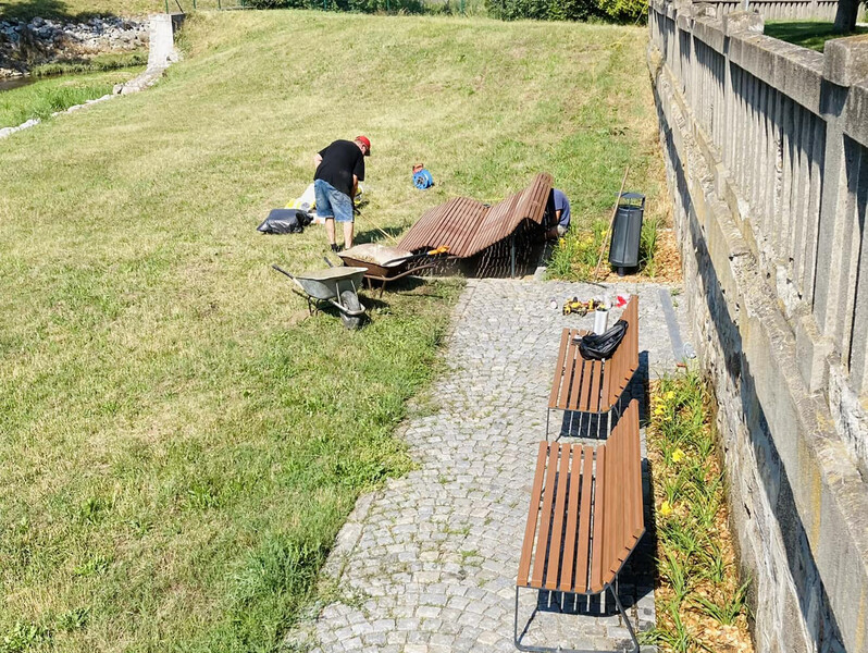 „Říční lavici, jak jí říkám, jsme instalovali dnes. Je čerstvě zabetonovaná a k užívání bude od čtvrtku," uvedla městská architektka Tereza Axmanová. Jde o atypický prvek městského mobiliáře, který evokuje říční a sluneční lázně. Poslouží k odpočinku v těsné blízkosti tekoucí vody.