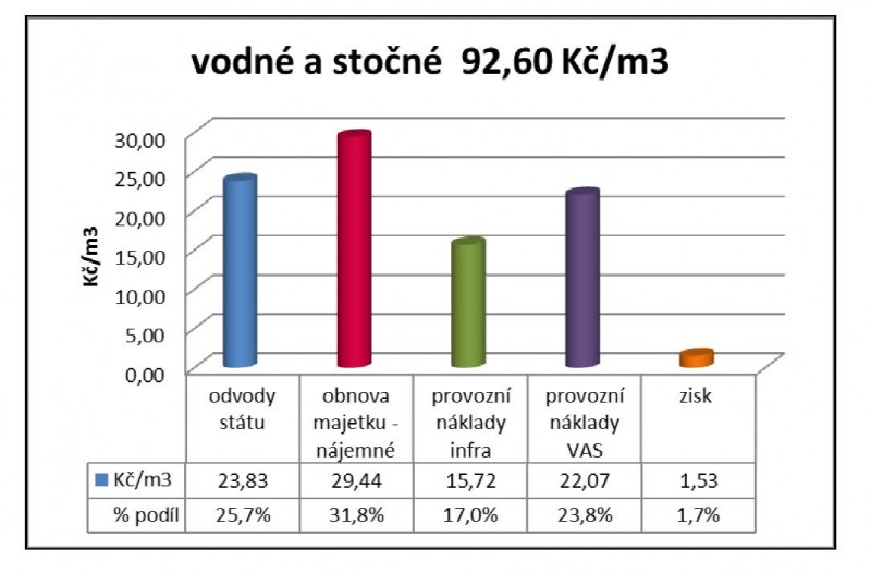 Aktuální skladbu vodného a stočného tak tvoří odvody státu (25,7 %), což jsou hlavně poplatky za odběr surové a podzemní vody, za vypouštěné odpadní vody apod. Dále nájemné (31,8 %) zahrnující náklady na rekonstrukce a obnovu majetku vodovodů a kanalizací, náklady na provoz a údržbu infrastruktury (17,0 %) a náklady provozovatele v celé kalkulaci (23,8 %). Průměrná míra zisku Svazku v ceně vodného a stočného tak činí 1,7 %, což je 1,53 Kč za kubík.