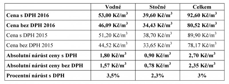 Voda bude od 1. ledna 2016 stát 92,60 Kč za kubík. To je zdražení o tři procenta, přesně o dvě koruny a sedmdesát haléřů.