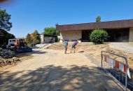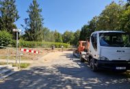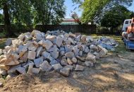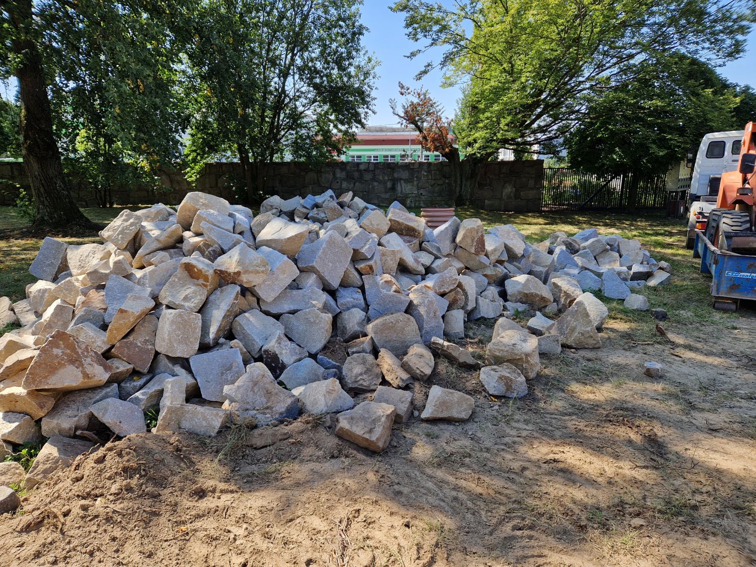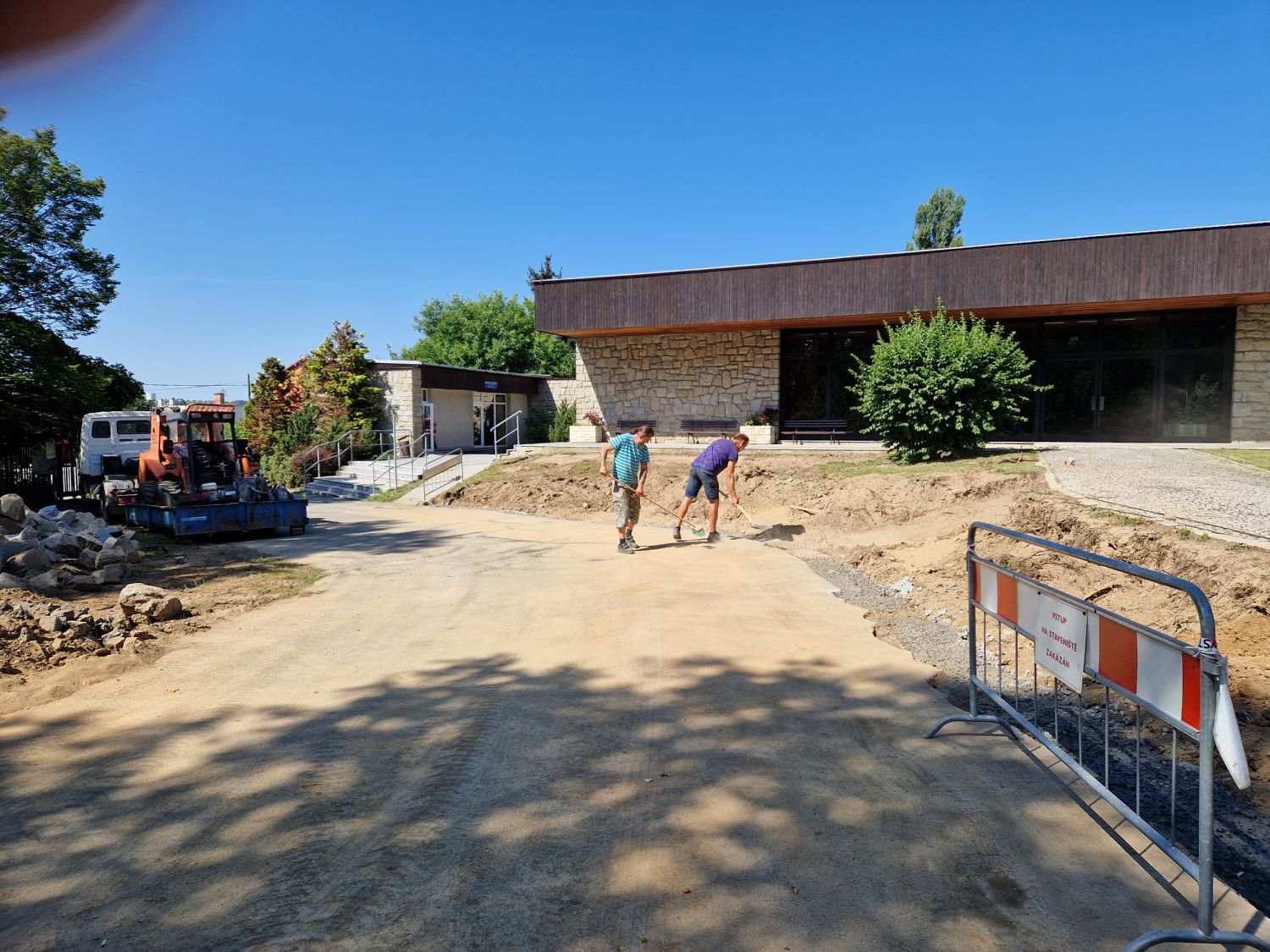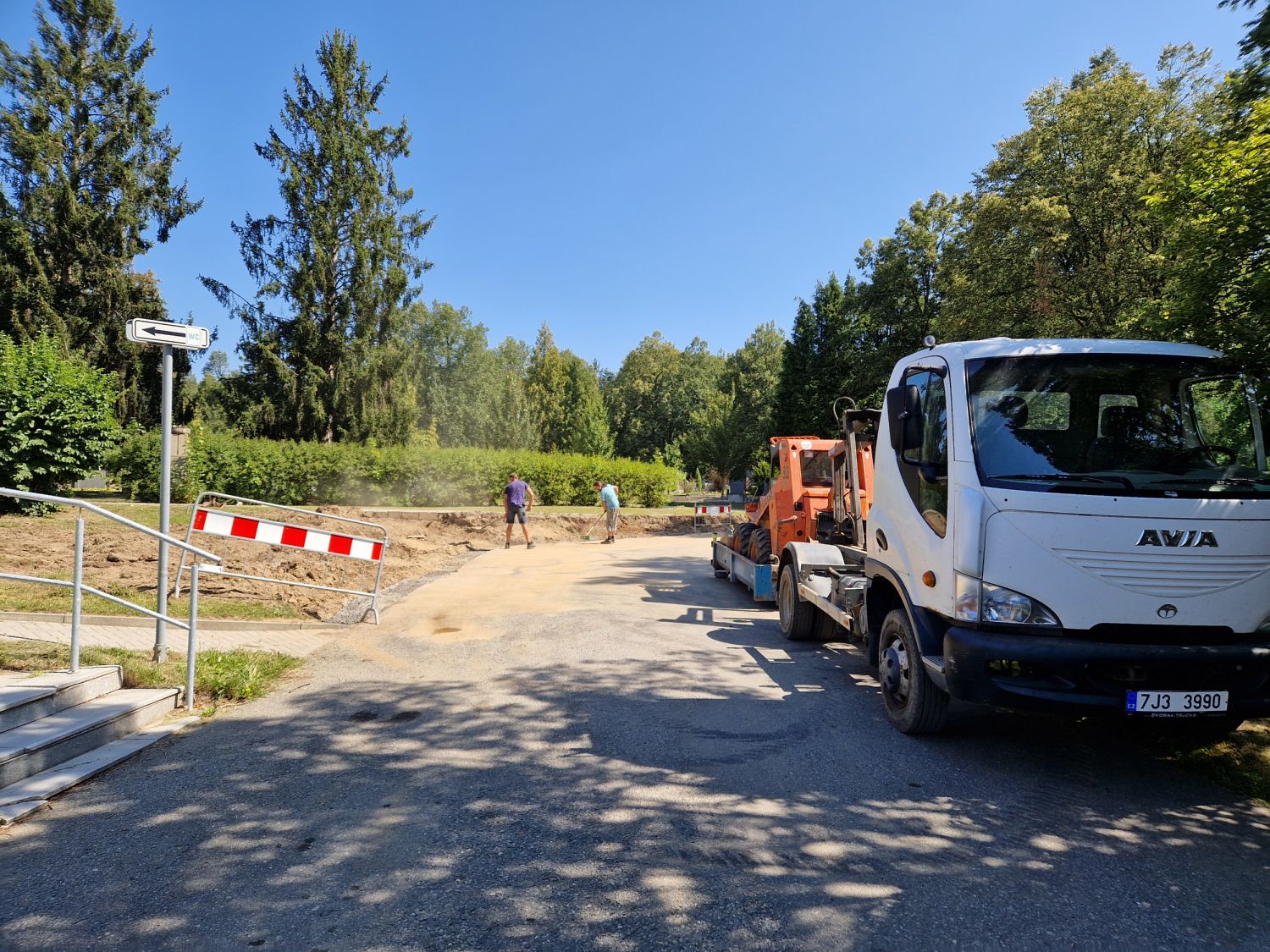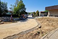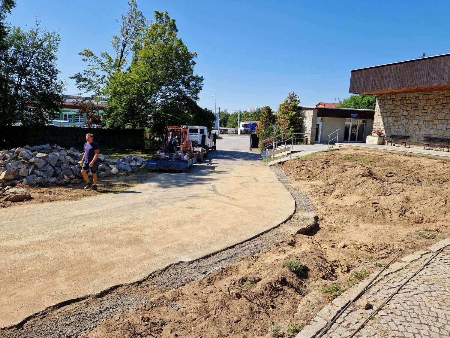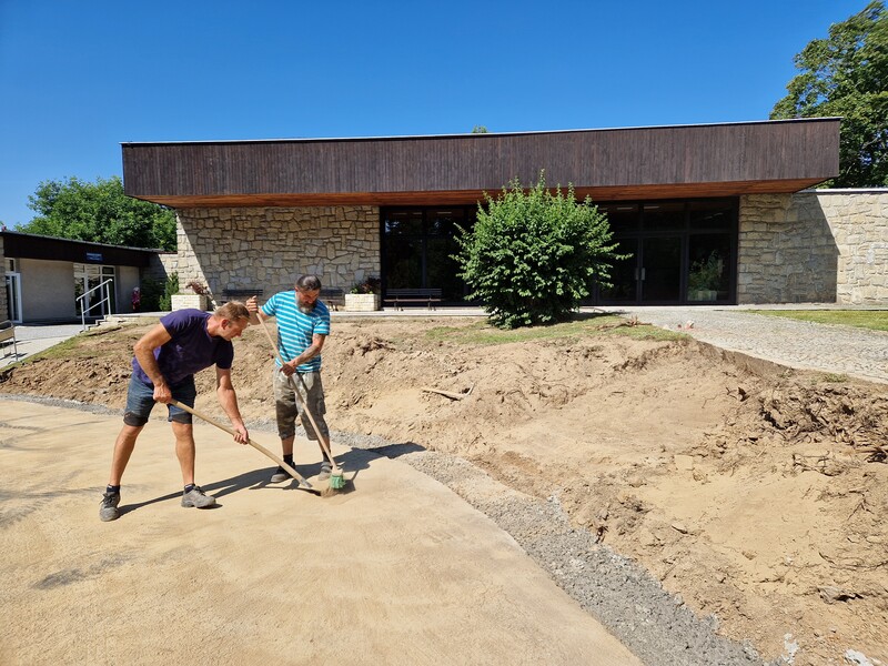 Základ pro kamenné zídky z mrákotínské žuly je připravený, nyní nastoupí kameníci, aby je postavili. Zídky zabrání splavování zeminy na komunikaci a současně do nich budou včleněny lavičky. Následovat budou finální terénní úpravy, osazení laviček a nová výsadba sloupovitých kvetoucích stromů – třešní pilovitých – kolem cesty k obřadní síni.