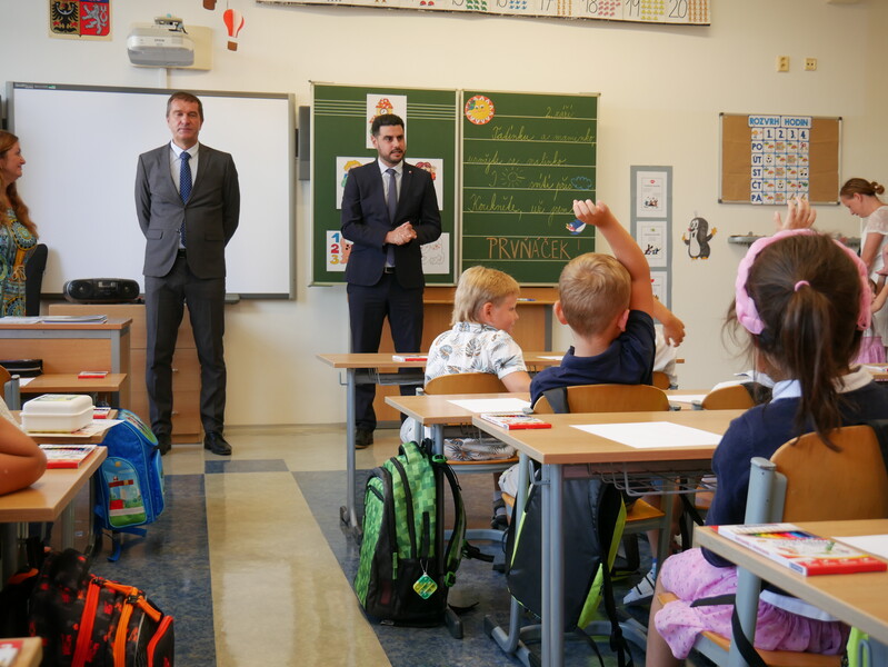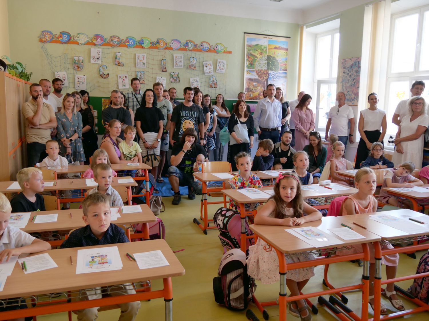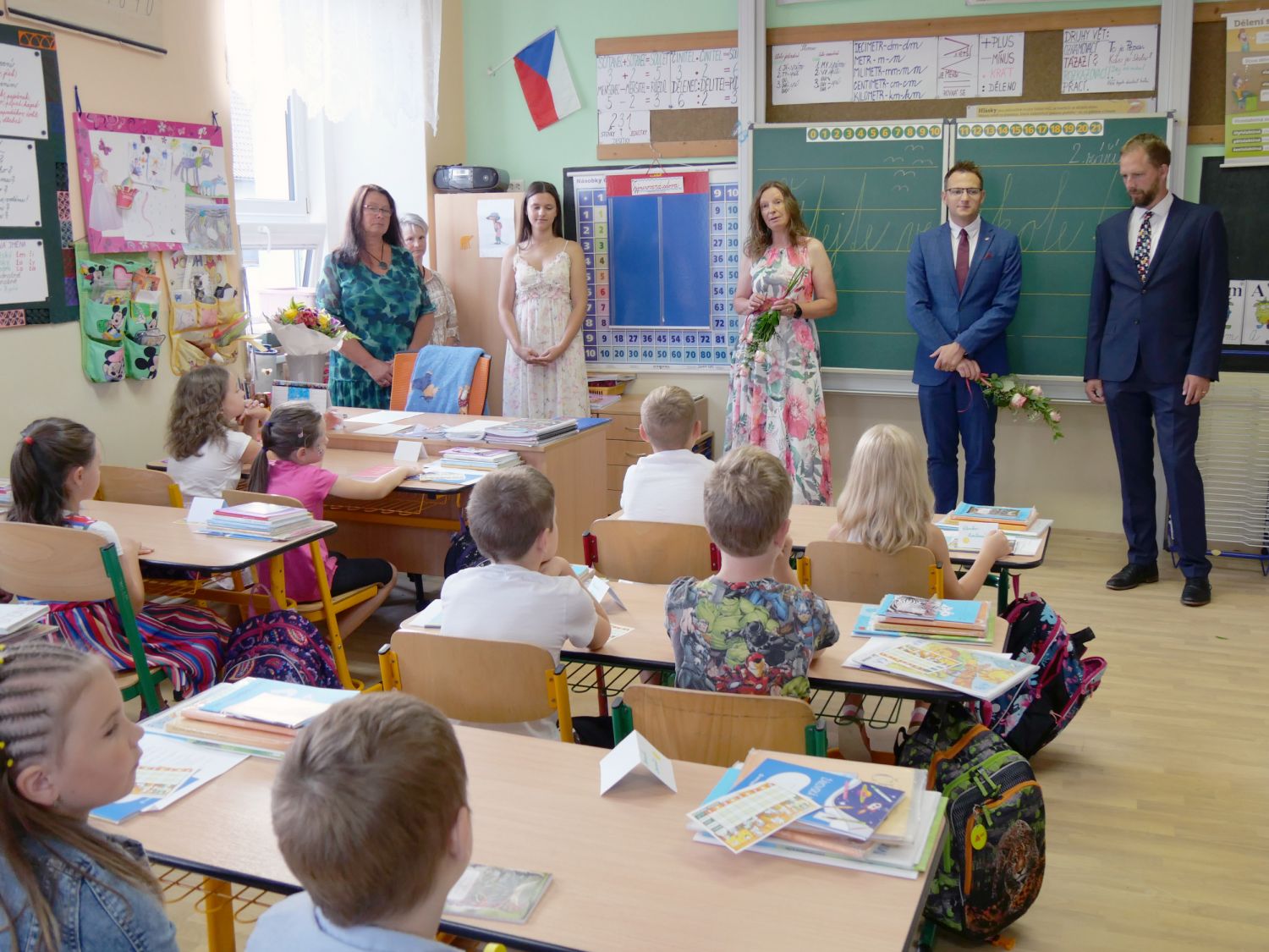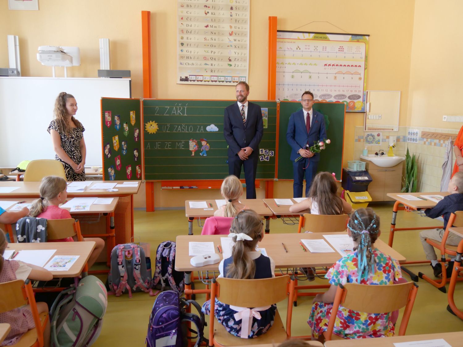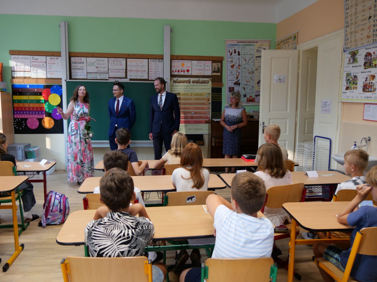 Prvňáčky na ZŠ Školní přivítal starosta města Alexandros Kaminaras, který dětem popřál, aby se jim ve škole líbilo a užili si to. „Devět let uteče jak voda a za chvíli už budete stát na pódiu při vyřazování deváťáků," uvedl starosta s tím, že čas ve škole, zvlášť v té dobré, letí rychle.
