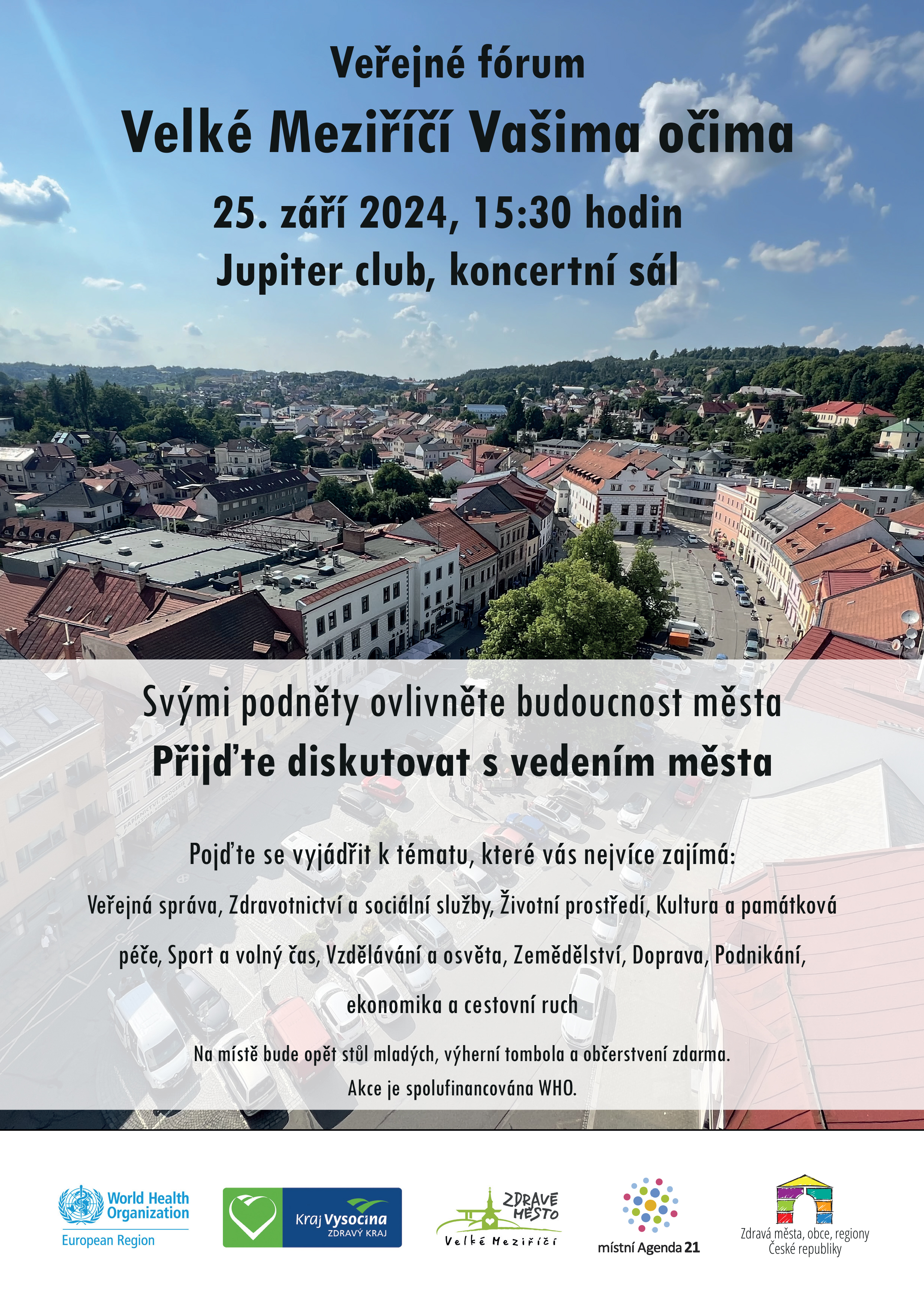 Město Velké Meziříčí zve obyvatele na Veřejné fórum – město vašima očima. Akce se koná ve středu 25. září od 15:30 hodin v koncertním sále Jupiter clubu. Svými podněty máte možnost ovlivnit budoucnost města a diskutovat o případných změnách s vedením města. Hlavními tématy setkání bude veřejná správa, zdravotnictví a sociální služby, životní prostředí, kultura a památková péče, sport a volný čas, vzdělávání a osvěta, zemědělství, doprava, podnikání, ekonomika a cestovní ruch. Těšit se můžete tradičně na tombolu, občerstvení zdarma a stůl mladých. Akce je spolufinancována WHO.