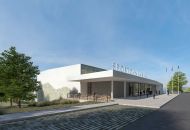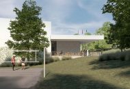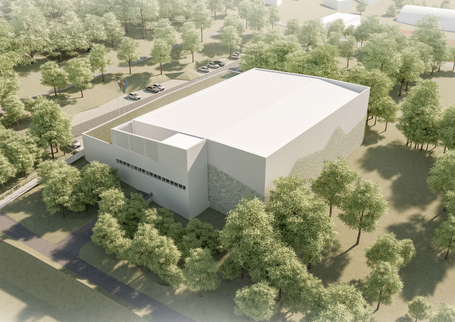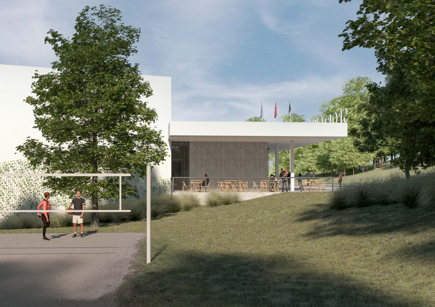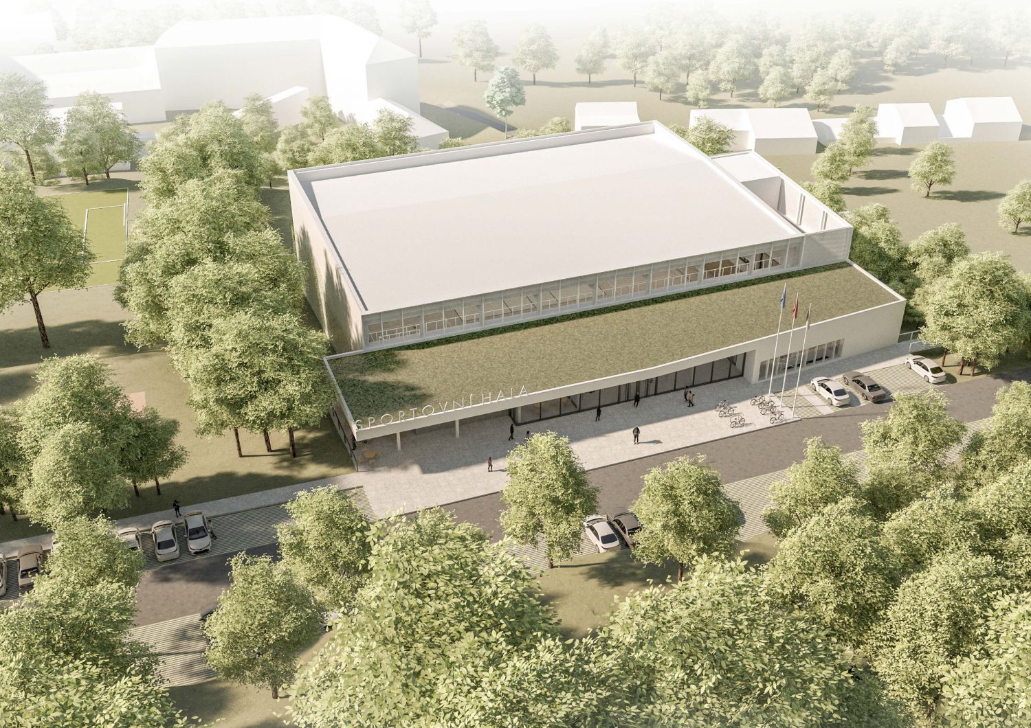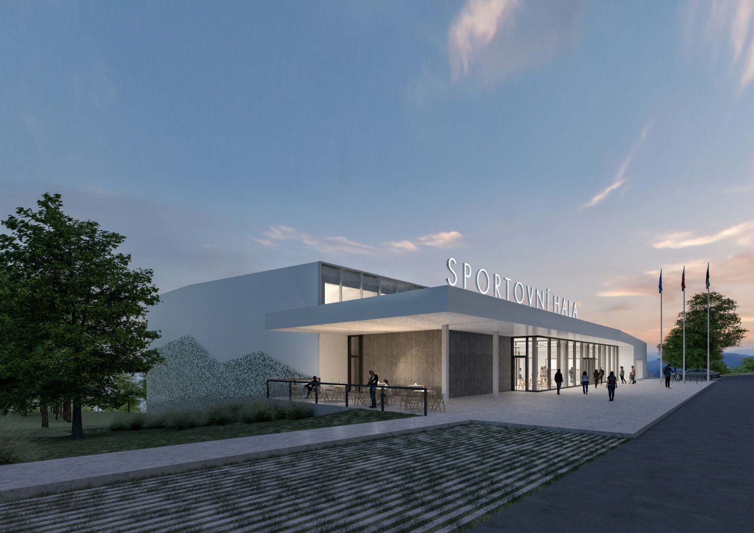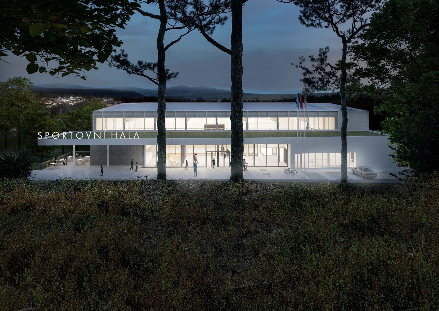 Hala bude zasazena do parku se spoustou vzrostlých stromů tak, aby s nimi co nejvíce splynula. „Její barevné ladění je proto co nejvíc neutrální v přírodních barvách – tedy beton, bílá barva a dřevěné obložení uvnitř, které má skvělé bezpečnostní i akustické vlastnosti,“ podotkl architekt a dodal, že fasáda ze strany hotelové školy bude porostlá zelení.