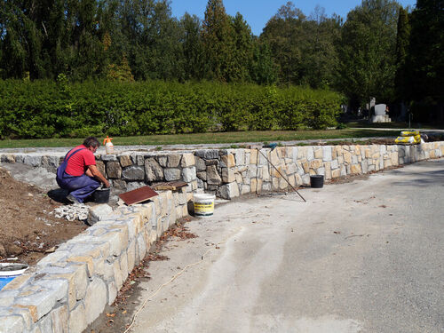 Prostor za vchodem a před obřadní síní na hřbitově na Karlově se proměňuje. V pondělí byla dokončena stavba nové kamenné zídky. Nyní se začne navážet zemina a v listopadu proběhne výsadba nových rostlin. Na protější straně přes cestu bude stávající neupravený terén dosypán a ručním hrabáním dorovnán.