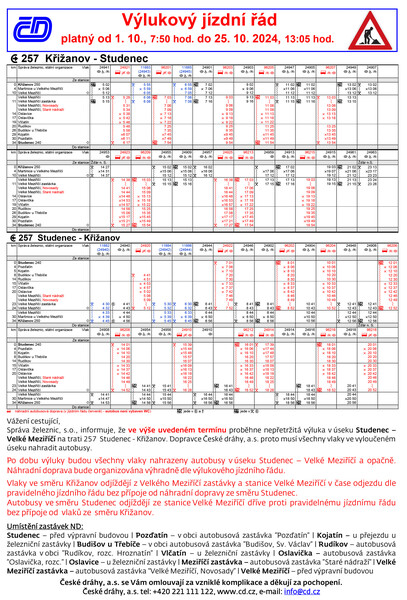 V úterý 1. října začne výluka na železniční trati z Velkého Meziříčí do Studence. Potrvá až do odpoledních hodin pátku 25. října. Vlaky budou mezi Velkým Meziříčím a Studencem nahrazeny autobusy, které budou jezdit podle výlukového jízdního řádu (viz níže). Ve Velkém Meziříčí budou autobusy stavět na nádraží před výpravní budovou, na autobusové zastávce Novosady a na autobusové zastávce Staré nádraží.