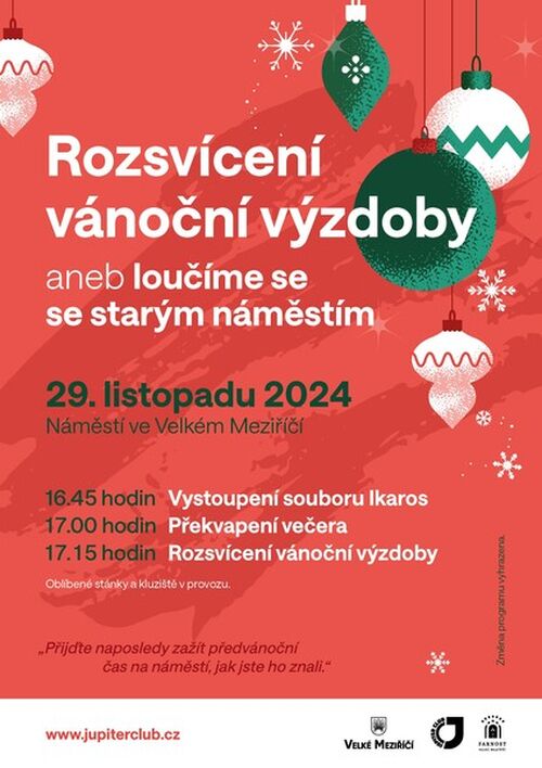 „První adventní víkend jsme opravdu pojali jako loučení se starým náměstím. Proto vše připravujeme o kousek větší, delší, zářivější a trochu slavnostnější než dosud,“ popisuje ředitelka Jupiter clubu Adéla Šoukalová a dodává: „Začínáme už v pátek slavnostním rozsvícením vánoční výzdoby města, která bude o poznání propracovanější a bude zvát k prosincovým večerním procházkám. Připravili jsme i tajné překvapení pro děti i dospělé. Zkrátka méně proslovů a více zábavy. V sobotu si všichni budou moci vyzdobené město užít i s oblíbenými stánky a kluzištěm a v neděli večer dětem přidáme venkovní promítání Ledového království přímo na náměstí.“