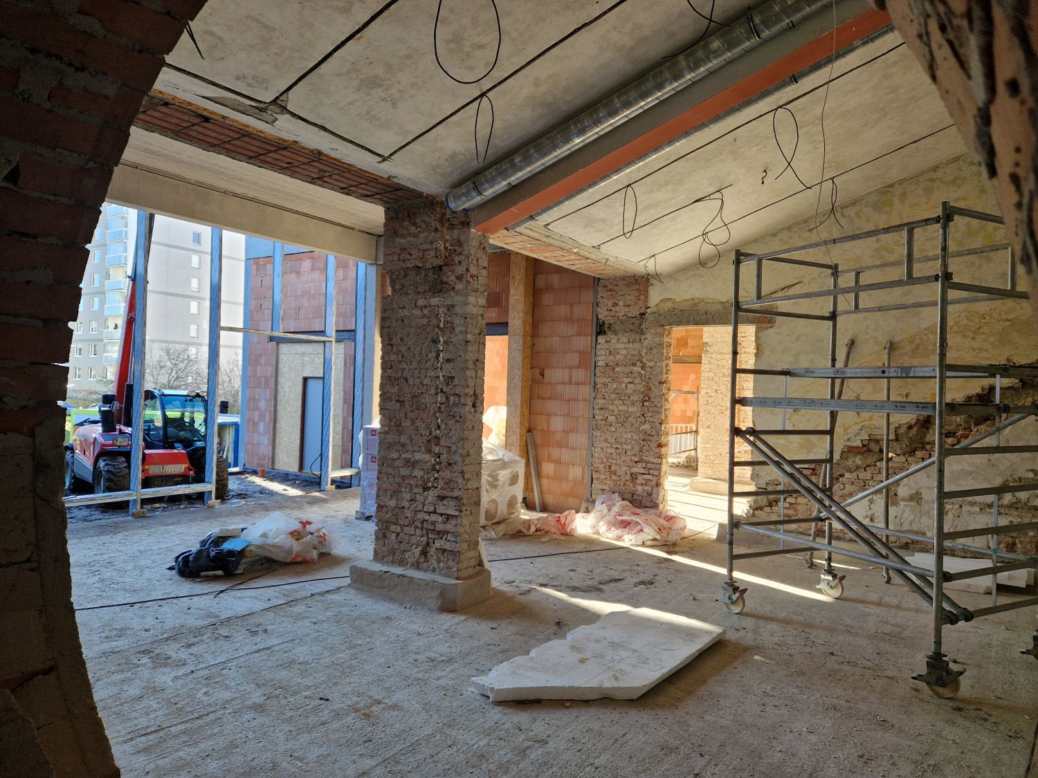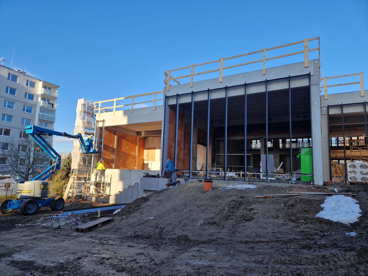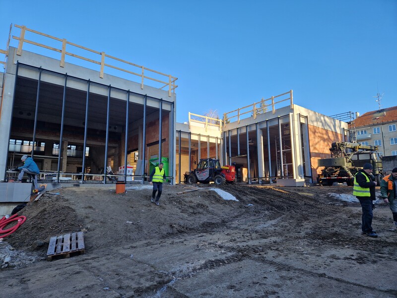 Aktuálně pracovníci dokončují osazení rámů velkých oken prosklené fasády, které budou ve čtvrtek a v pátek zasklívat. „Uvnitř děláme rozvody vzduchotechniky, v plné práci jsou elektrikáři, betonujeme hlediště v malém sále. Po uzavření objektu nastoupí topenáři a vzduchotechnici a začneme dělat omítky. V dubnu, podle počasí, se pustíme do fasády. A pak budou následovat práce na venkovních plochách, dlažby a exteriérové prvky,“ informoval stavbyvedoucí Vladimír Hort.