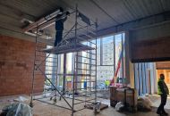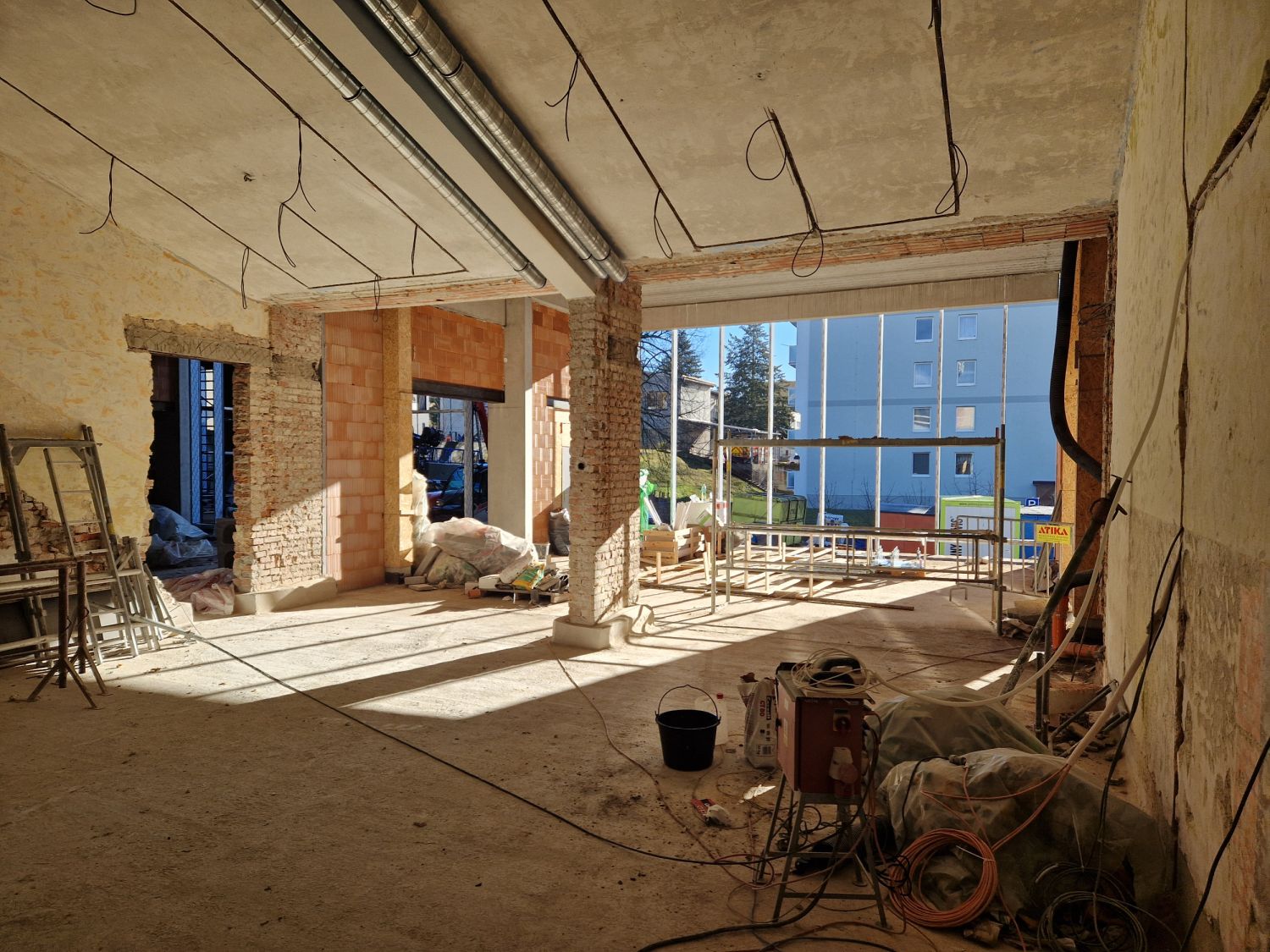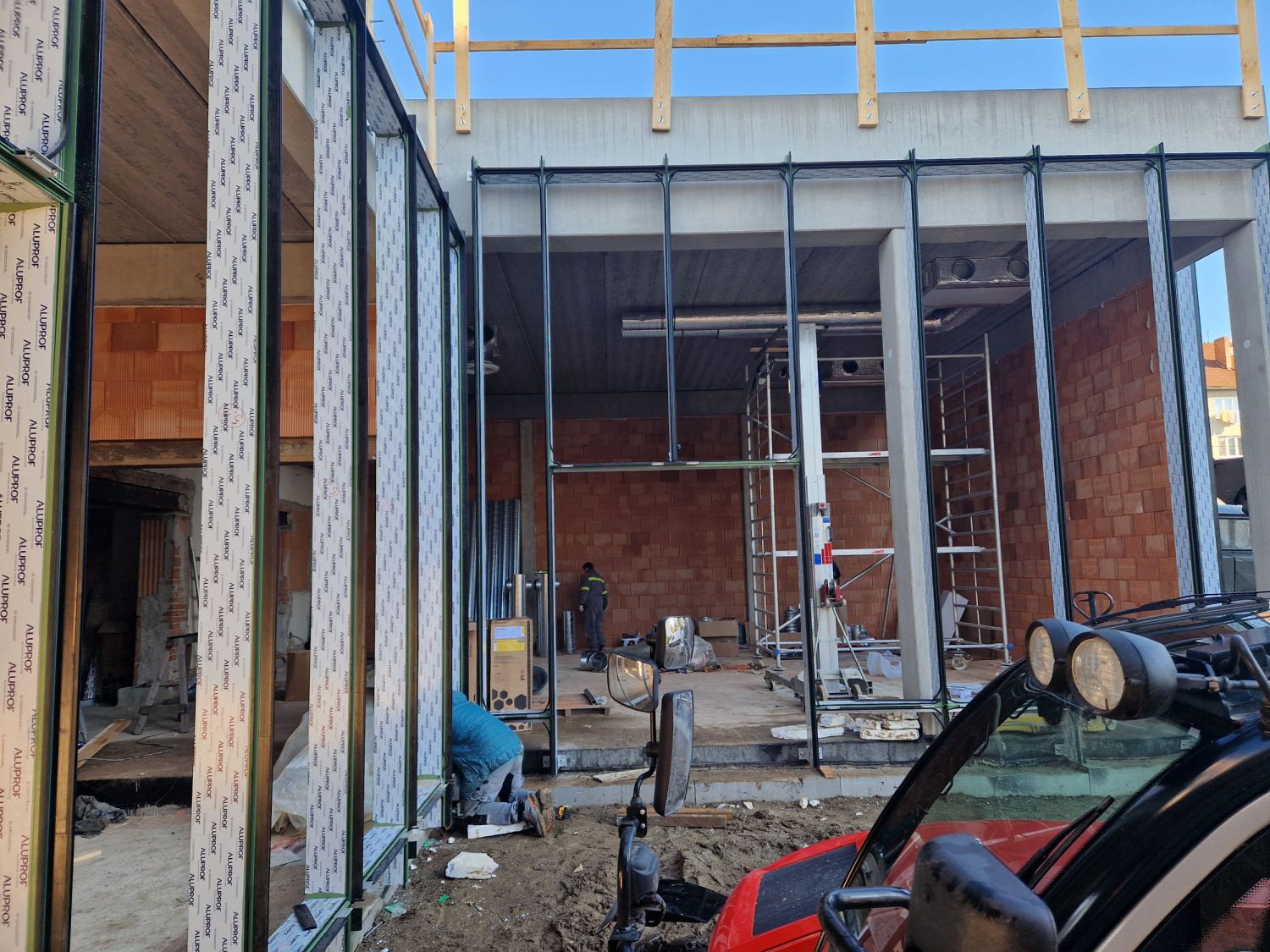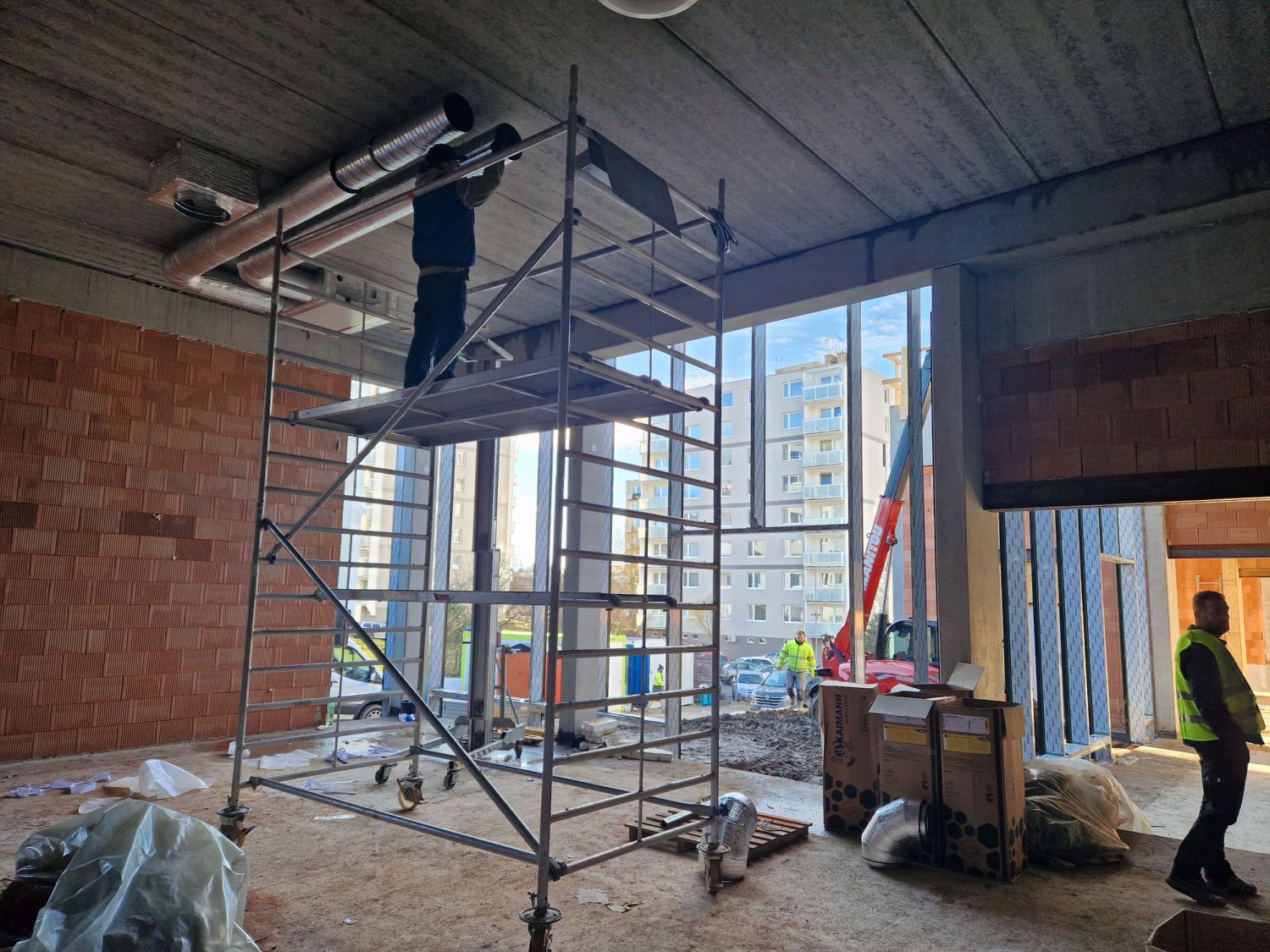 Aktuálně pracovníci dokončují osazení rámů velkých oken prosklené fasády, které budou ve čtvrtek a v pátek zasklívat. „Uvnitř děláme rozvody vzduchotechniky, v plné práci jsou elektrikáři, betonujeme hlediště v malém sále. Po uzavření objektu nastoupí topenáři a vzduchotechnici a začneme dělat omítky. V dubnu, podle počasí, se pustíme do fasády. A pak budou následovat práce na venkovních plochách, dlažby a exteriérové prvky,“ informoval stavbyvedoucí Vladimír Hort.