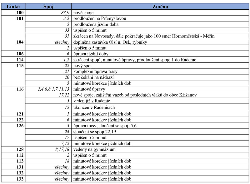 Odbor dopravy Krajského úřadu Kraje Vysočina na základě připomínek vzešlých od občanů, zástupců obcí, dopravců, a i na základě dat získaných z prvního měsíce provozu dle nových jízdních řádů, připravil k 2. březnu drobné změny v jízdních řádech pro oblasti Bystřicko a Velkomeziříčsko, Žďárské vrchy, Polensko a Havlíčkobrodsko.