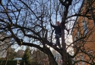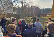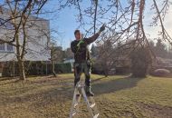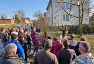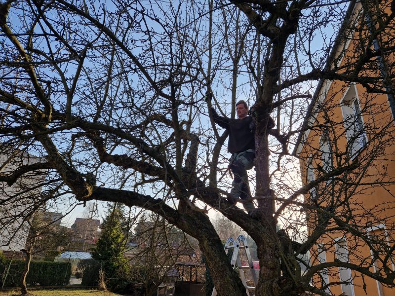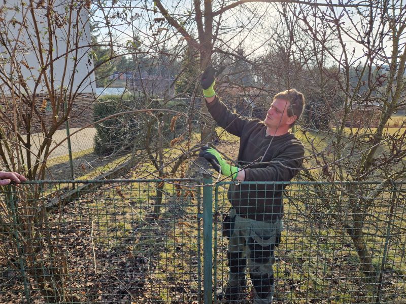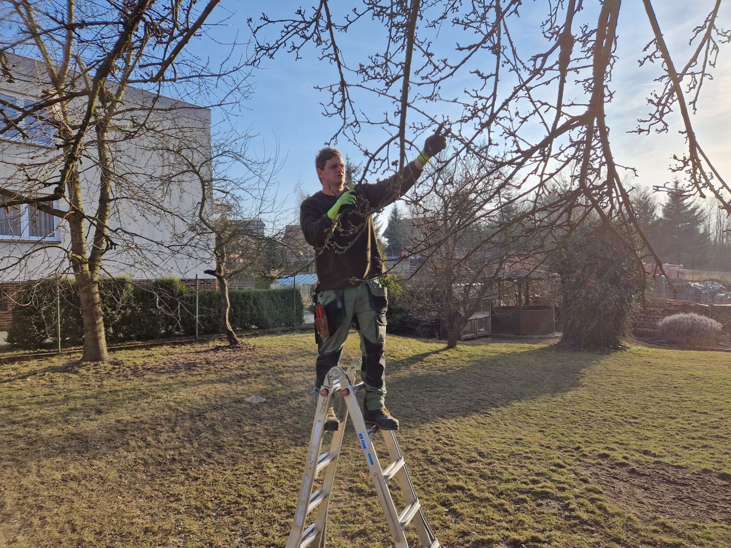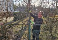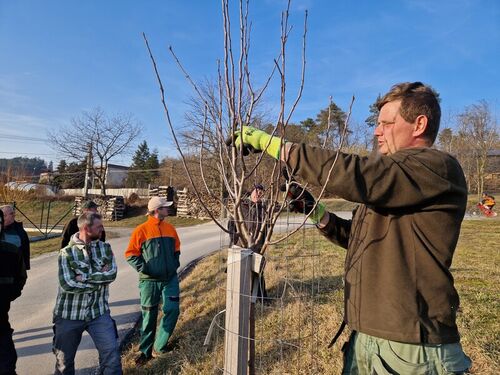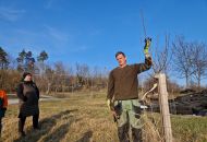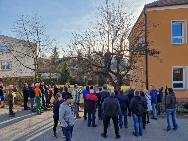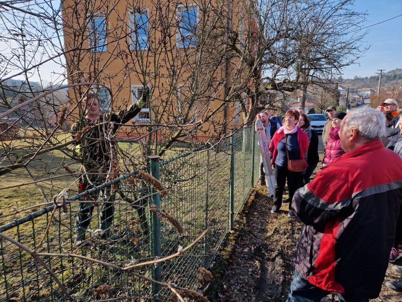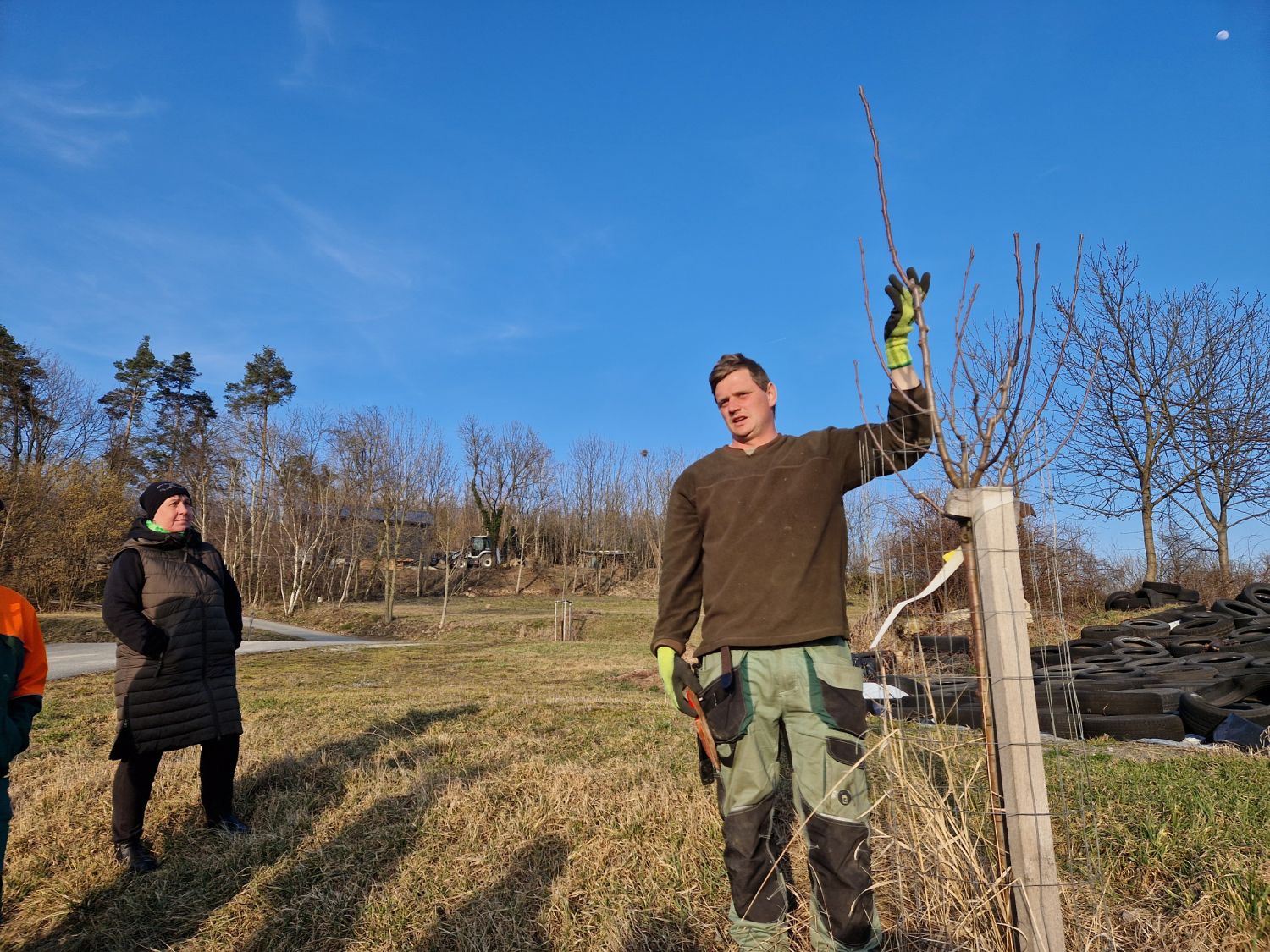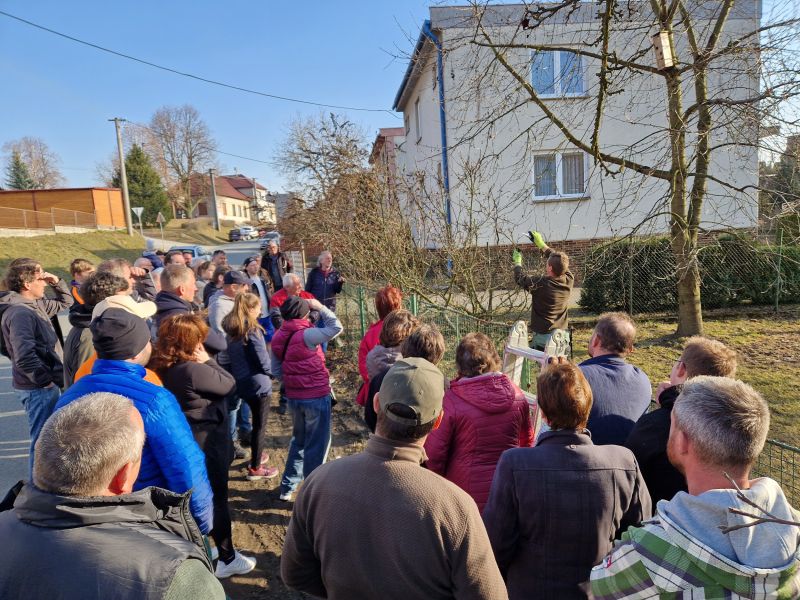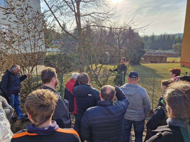 Po teoretické průpravě se skupina vydala do školní zahrady, kde Jan Oulehla doplnil svoje povídání praktickými ukázkami řezu starých jabloní. Výchovný řez pak ukázal na hrušních, které ve Lhotkách vysadili dobrovolníci v roce 2023.