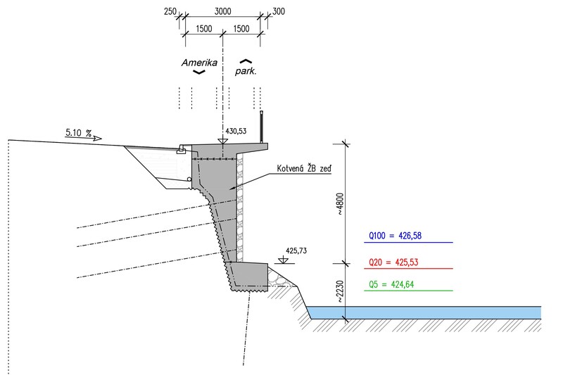 O co se jedná konkrétně? Projektovat se bude varianta jejíž součástí je železobetonová opěrná zeď o délce zhruba šedesát metrů a kopírující stávající silnici směr Uhřínov. Po koruně zdi povede tři metry široká stezka (viz obrázek příčného řezu opěrné zdi). Projektová dokumentace bude řešit i prostor u křižovatky s ulicí Zahradní, kde je dnes neoficiální parkovací plocha. Tady bude cyklostezka vyúsťovat a tomu bude uzpůsobena i parkovací plocha, která se stane oficiální (viz obrázek).