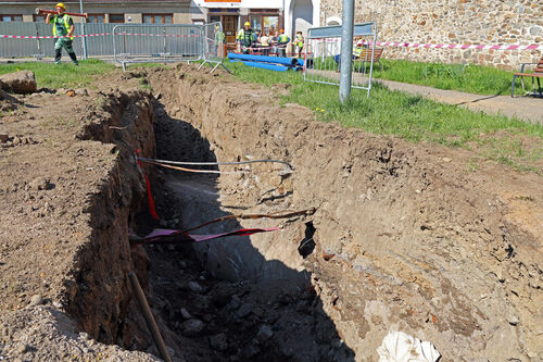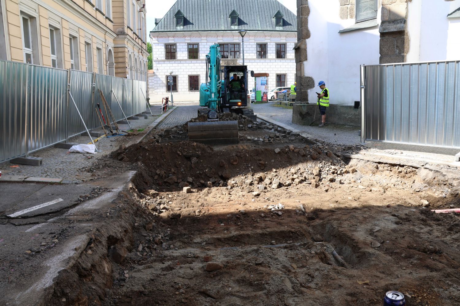 Stavaři aktuálně pracují U Bašty a za hradbami, vyfrézovali asfalt a provedli skrývku v ulicích Komenského a Kostelní, kde již rozjeli svůj záchranný výzkum archeologové.