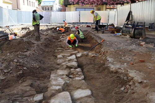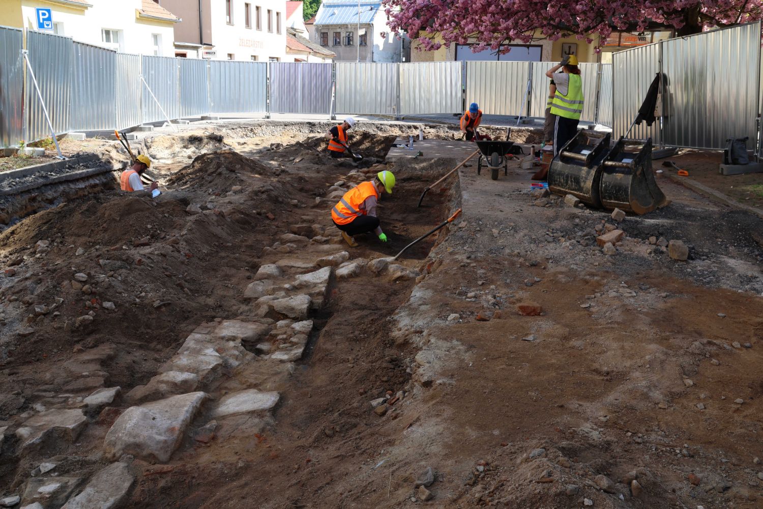 Archeologové jsou v Kostelní ulici teprve pár dní a již narazili na první objevy. Odkryli základy domu i s dochovanou dlažbou, dále dláždění ulice kočičími hlavami, zatrubněný mlýnský náhon a v jednom místě možná i jeho původní kamenité zpevnění. Základy domu jsou mladé, asi z devatenáctého století. V některých místech ulice se archeologové začínají dostávat do období středověku.