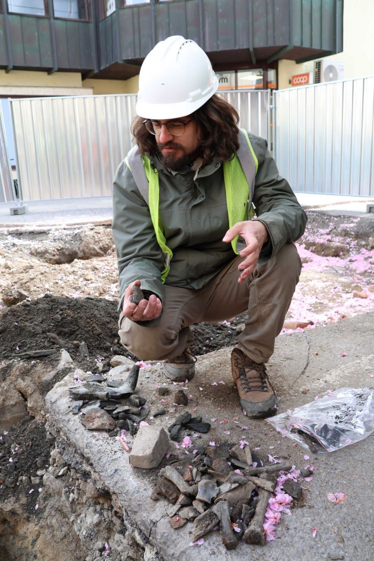 Dalším zajímavým nálezem v Kostelní ulici je pravěká sekyrka z břidlice. Archeologové ji objevili ve středověké vrstvě, což značí, že sekyrka sem byla přenesena odjinud. „Lidé ve středověku věřili, že je ochrání před úderem blesku, proto si ji dávali jako takový hromový klín někam ke komínu či za trám domu,“ vysvětlil Kochan. V místě u Kotvičky je pod zemí trativod a řada dřevěných a kožených fragmentů. Dřevo poputuje na dendrochronologické určení, které přesněji napoví období, kdy byl strom pokácen. V jedné vrstvě výkopu lze spatřit i takzvanou mazanici, která dokládá požár domu, jenž v těch místech stál.