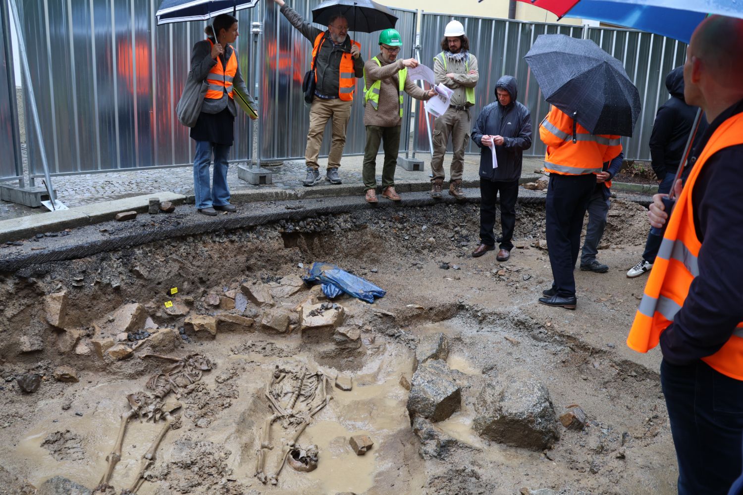 Archeologové potvrdili nález městského hřbitova a jeho staršího středověkého ohrazení přecházejícího ohradní zdi patrné na vedutě z počátku 18. století. Na hřbitově zatím objevili asi 95 hrobů s kosterními pozůstatky lidí pohřbených nejčastěji v 15. až 16. století. „Našli jsme jeden zajímavý pohřeb, kde je hlava oddělená od těla a lebka leží v nohou. Jsou v ní zbytky krčních obratlů a dolní čelist drží na lebce, takže k oddělení nedošlo později. Předpokládáme proto, že jde o pohřeb popraveného, což vysvětluje i umístění za hřbitovní zdí,“ vysvětlil Pavel Staněk.