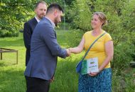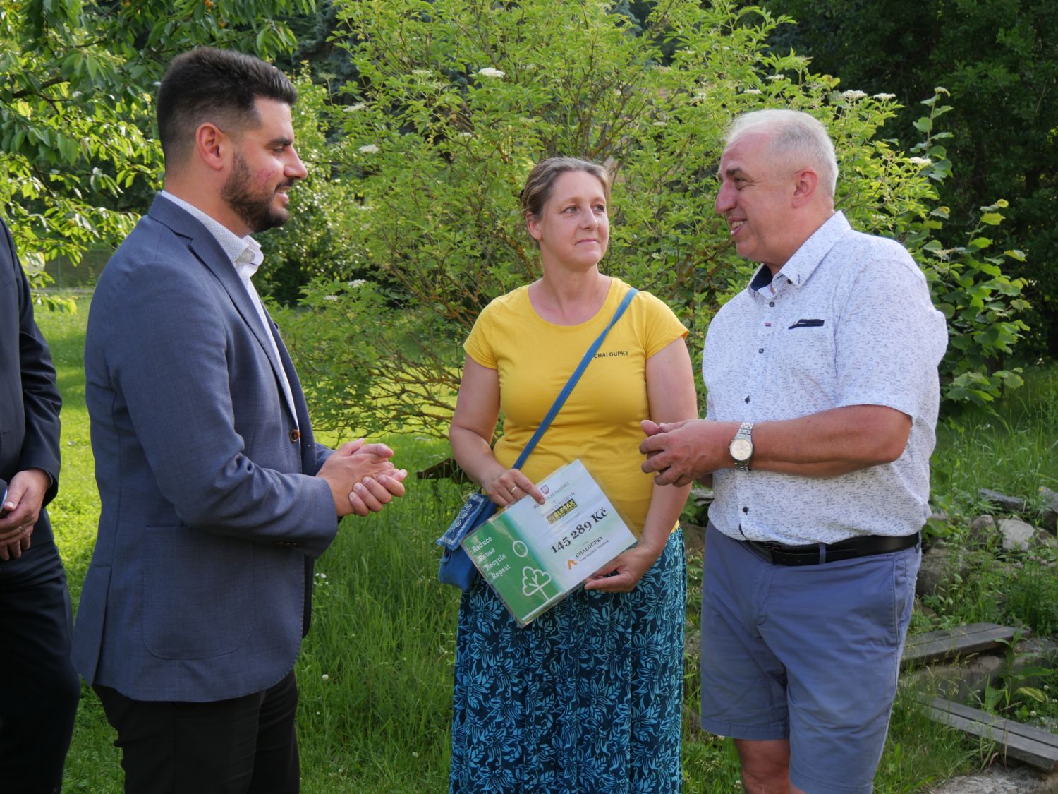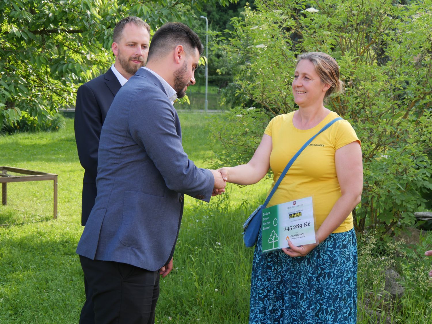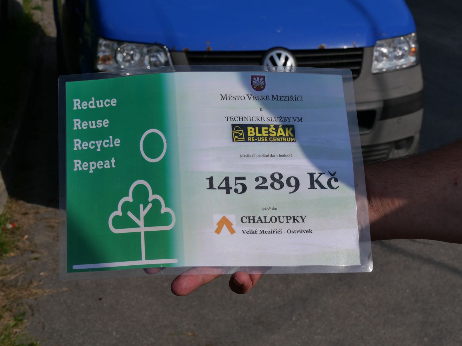 Ve středu v podvečer se na zahradě Střediska ekologické výchovy Chaloupky na Ostrůvku odehrála malá slavnost. Starosta města Alexandros Kaminaras v doprovodu místostarosty Martina Kamana, radních Andrey Vašíčkové a Josefa Prokopa a jednatele Technických služeb Velké Meziříčí Jaroslava Mynáře předal vedoucí ekocentra Janě Audy dar ve formě šeku s částkou 145 289 korun, která je výnosem veřejné sbírky re-use centra. „Jsem příjemně překvapen, s tak vysokou částkou jsme nepočítali," uvedl jednatel Technických služeb Velké Meziříčí Jaroslav Mynář.