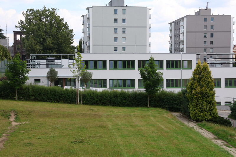 Fasáda na knihovně viditelná z ulice Poštovní je hotová, v současné době stavbaři připravují nosnou konstrukci pro následné opláštění zadní strany budovy, která je otočená do zahrady a je z velké části prosklená.