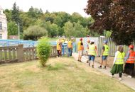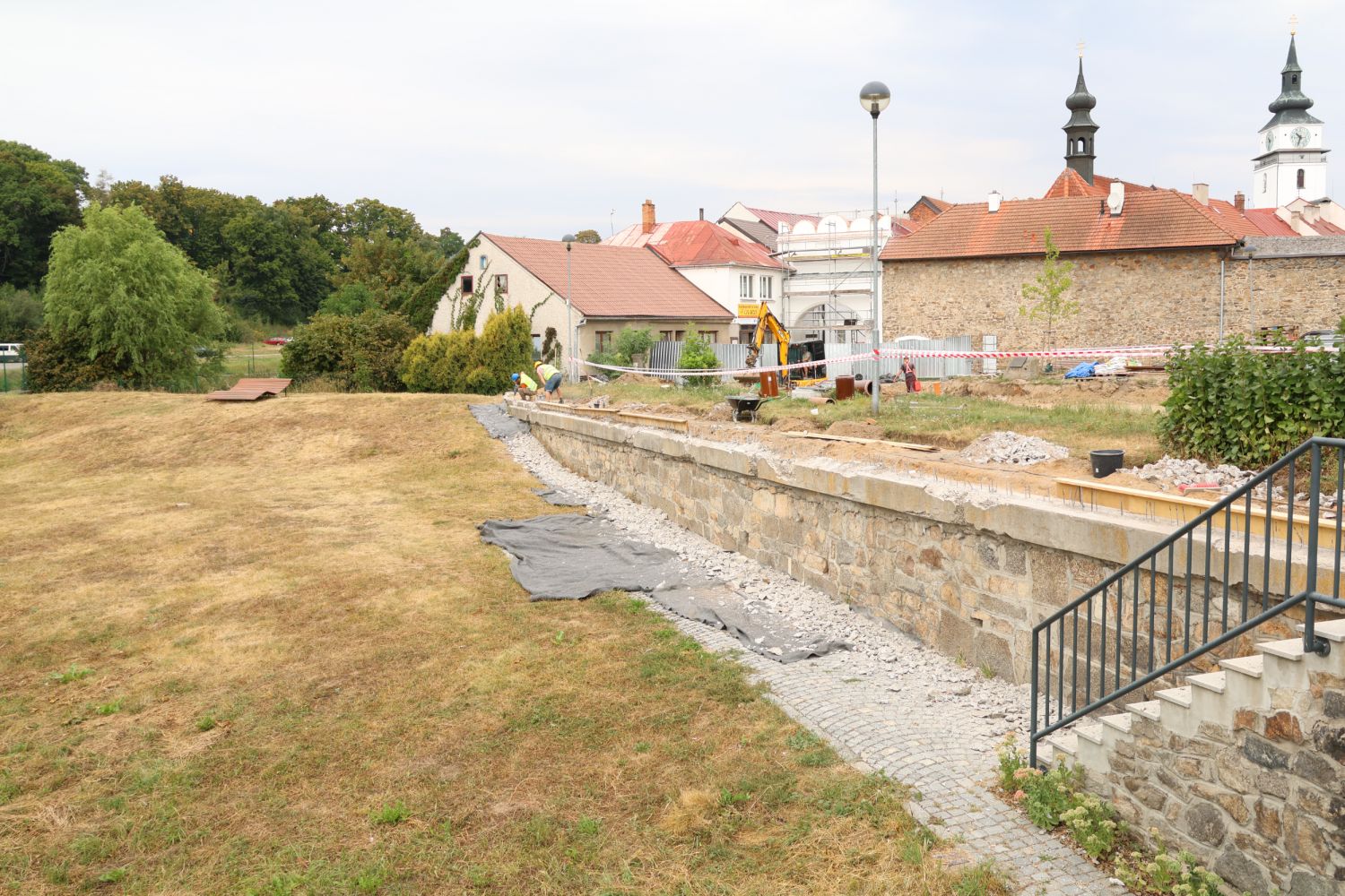 Práce pokračují i při soutoku řek. Stavbaři odbourávají zábradlí a staré chodníky. Vsakovací objekt pro odvodnění Komenského ulice je dokončený a zasypaný. Lávka z Ostrůvku přes Balinku je otevřená, chodci mohou projít přímo na Novosady.