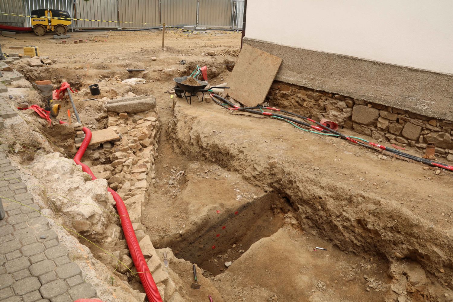 Záchranný archeologický průzkum dlouhodobě probíhá kolem kostela, v místě středověkého hřbitova. Vedle hrobů a různých drobných, ale významných nálezů, mezi něž patří třeba i pravěký nástroj, archeologové odkryli i další část asi dva metry hlubokého příkopu. Ten zhruba kopíruje mladší hřbitovní zeď. Pravděpodobně nad ním byla palisáda, která společně s valem sloužila k obraně osídlení, které se nacházelo uvnitř na místě nynějšího kostela.