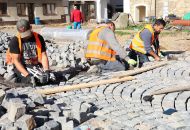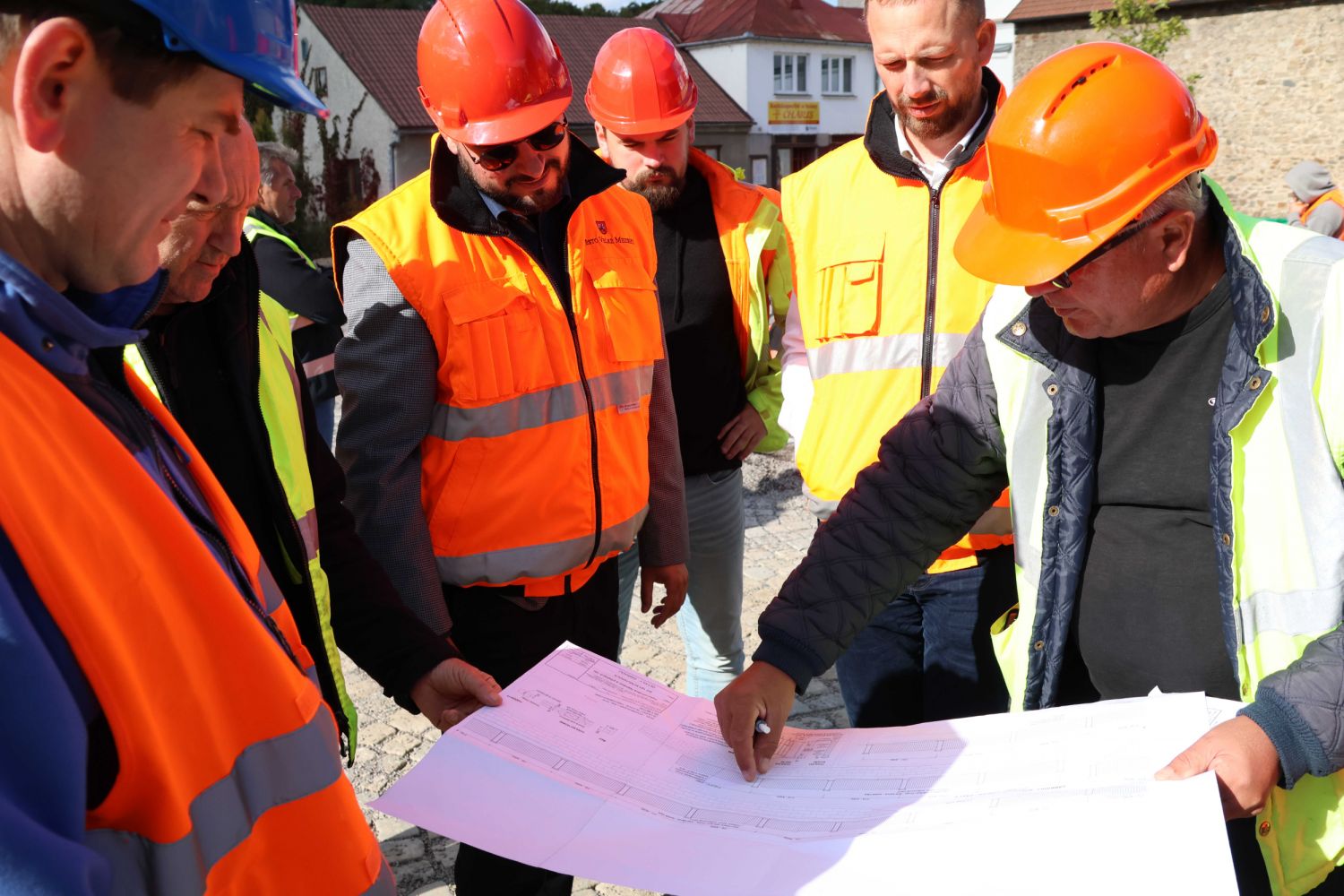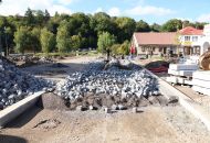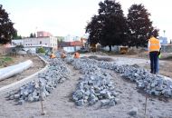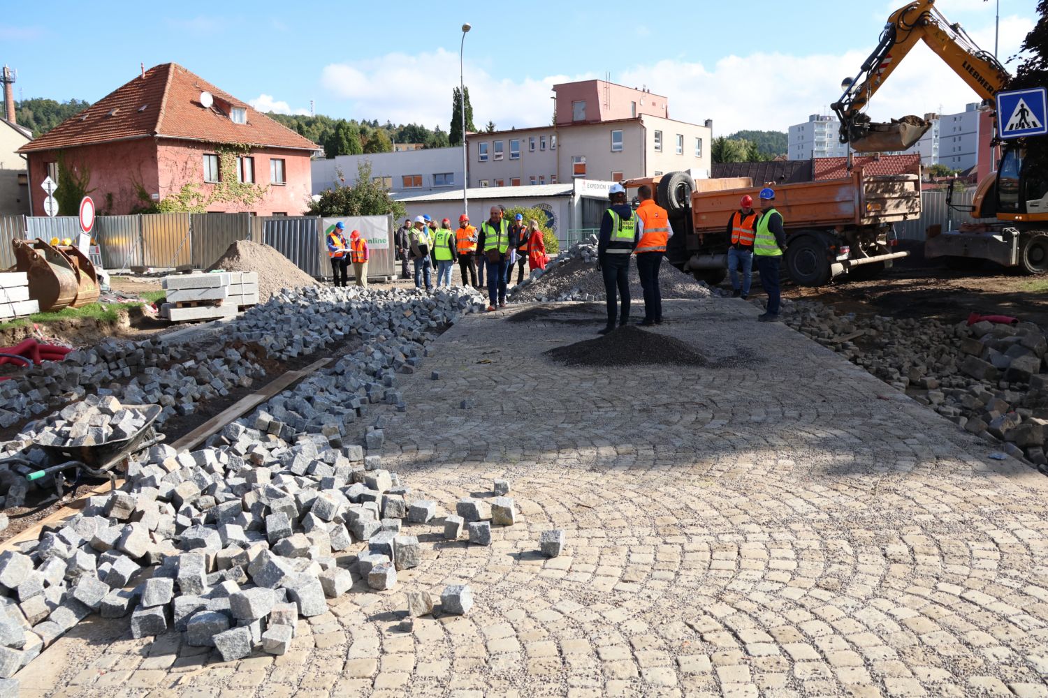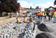 Po odchodu plynařů z Komenského se stavbaři pustí do přípravy podkladů pro obrubníky a následně i konstrukčních vrstev pod komunikaci, aby mohli pokračovat s dlážděním od Šebestiánu směrem do Komenského i části ulice U Bašty. Ta musí na kompletní vydláždění ještě nějakou dobu počkat, protože farnost opravuje špitálek a přes ulici U Bašty stavbu zásobuje materiálem.
