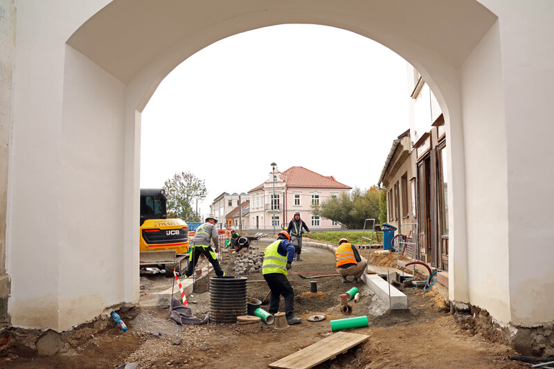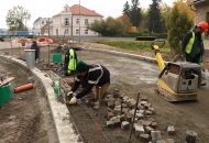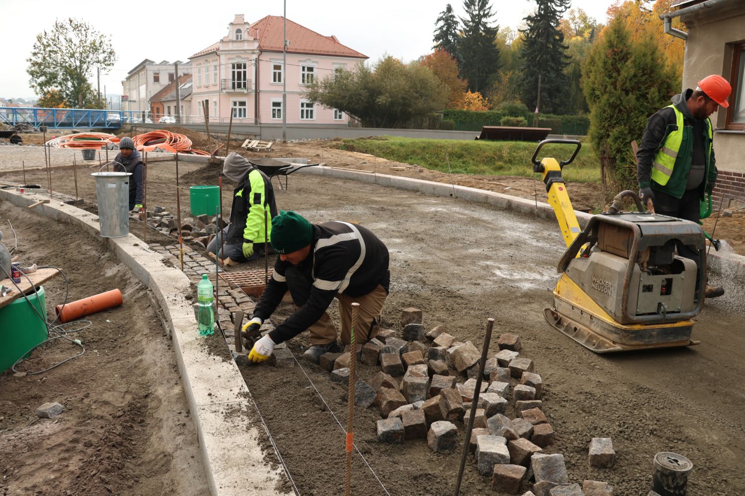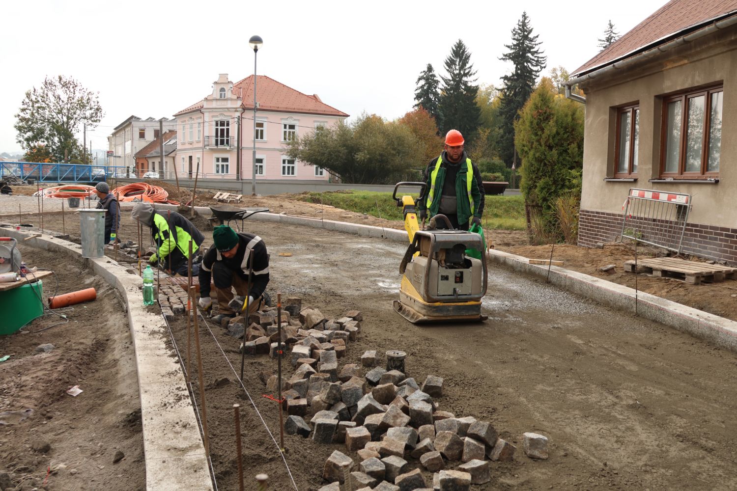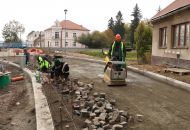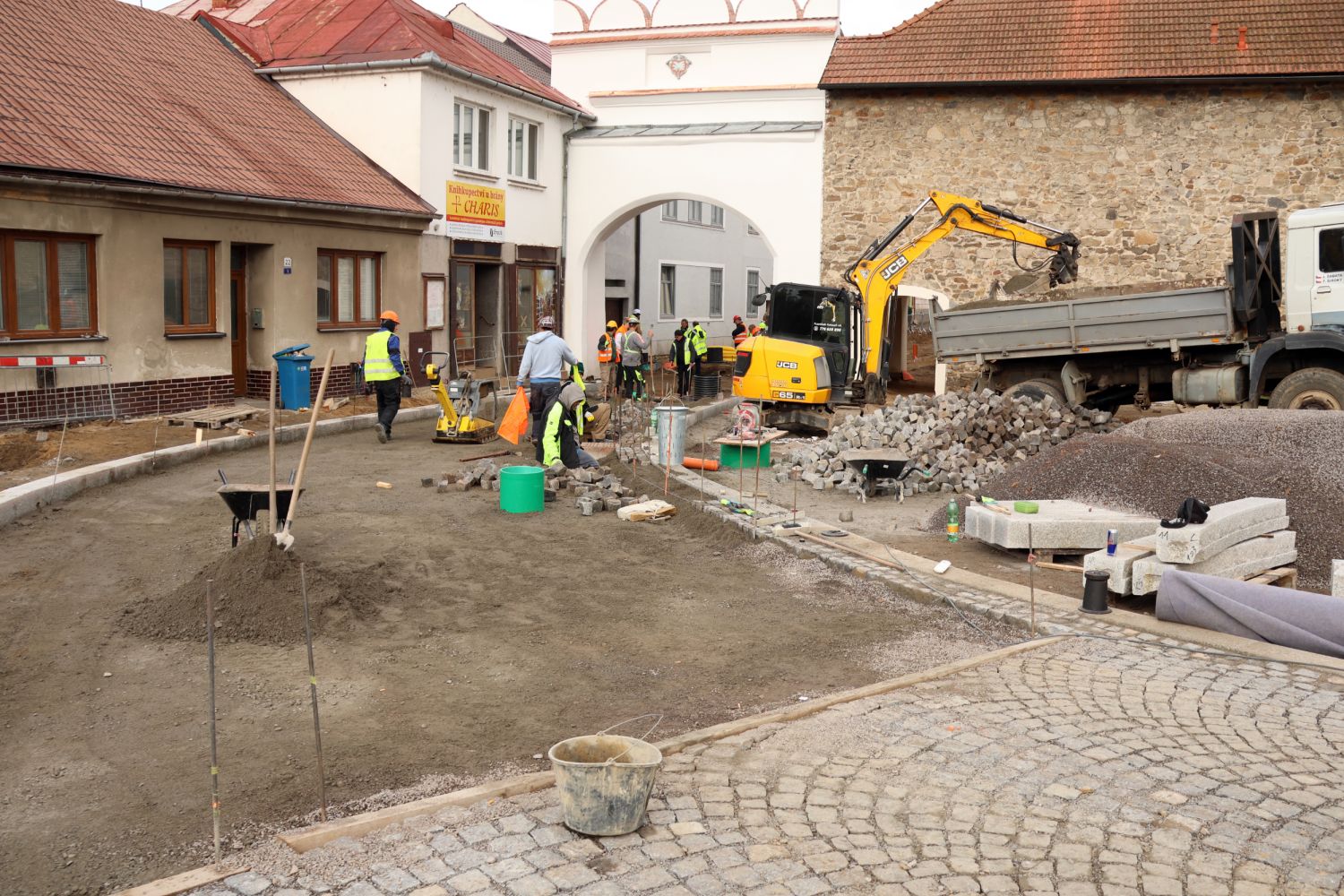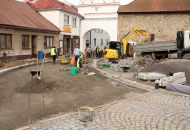 Dláždění postupuje od výjezdu z náměstí do Komenského ulice, kde jsou práce na kanalizaci, plynu i vodovodu dokončené. Nové dlažby se brzy dočká i parkoviště u Kotvičky. Zatímco v dolní části náměstí pokračují práce na kanalizaci, plynaři se v příštím týdnu přesunou do úzké uličky mezi kostelem a prodejnou nábytku.
