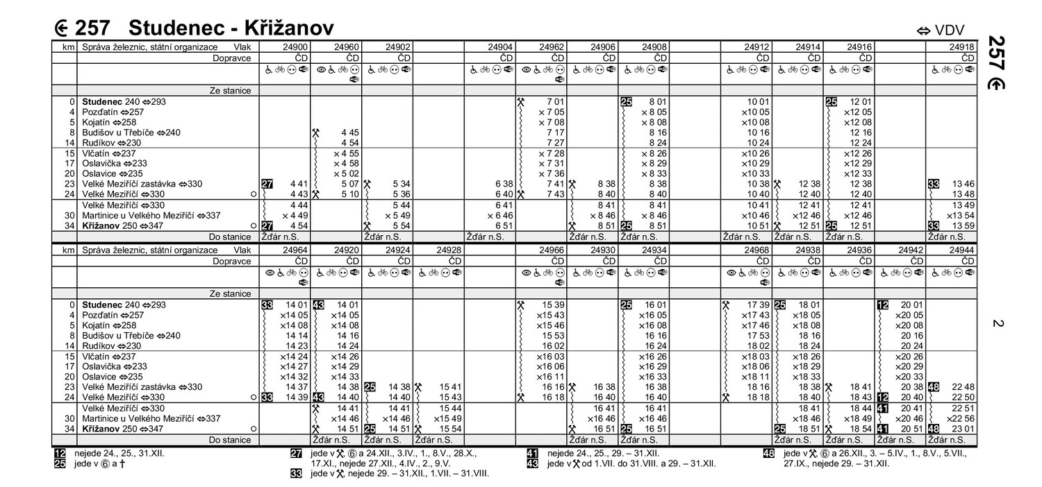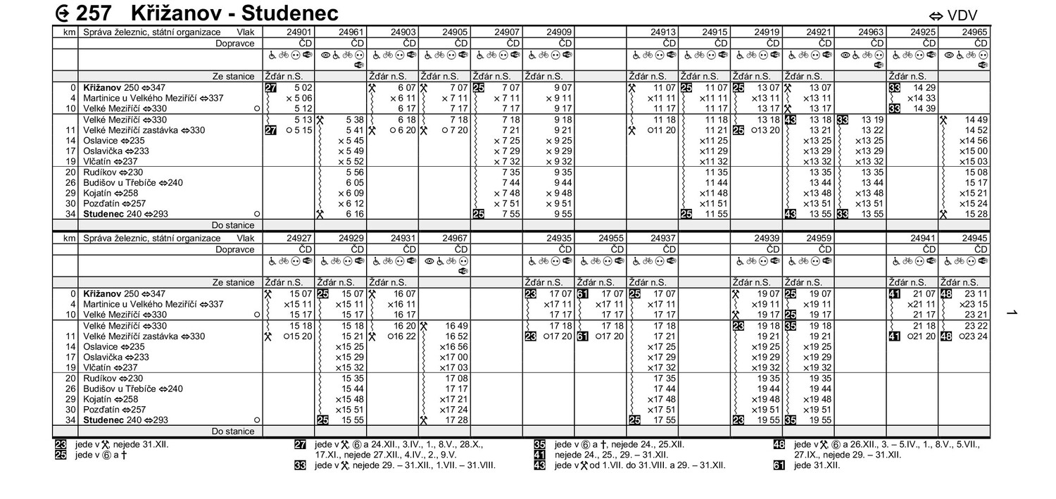 Týká se to většiny spojů. Vlak odjíždějící z Velkého Meziříčí v 5:44 hodin, dorazí do Křižanova v 5:54 hodin. Rychlík na Brno odjíždí z Křižanova v 6:04 hodin. Velmi podobná situace je pak u spojů odjíždějících z Velkého Meziříčí v 6:41, 8:41, 10:41, 12:41, 14:41, 16:41, 18:44 a 20:41 hodin. V opačném směru, vlak odjíždějící 5:16 hodin z Brna přijede do Křižanova v 6:04 hodin, návazný vlak na Velké Meziříčí odjíždí v 6:07 hodin. Podobně jsou na tom i vlaky odjíždějící z Brna 6:15, 8:13, 10:13, 12:13, 14:13, 15:13, 16:13, 18:13 a 20:13 hodin.