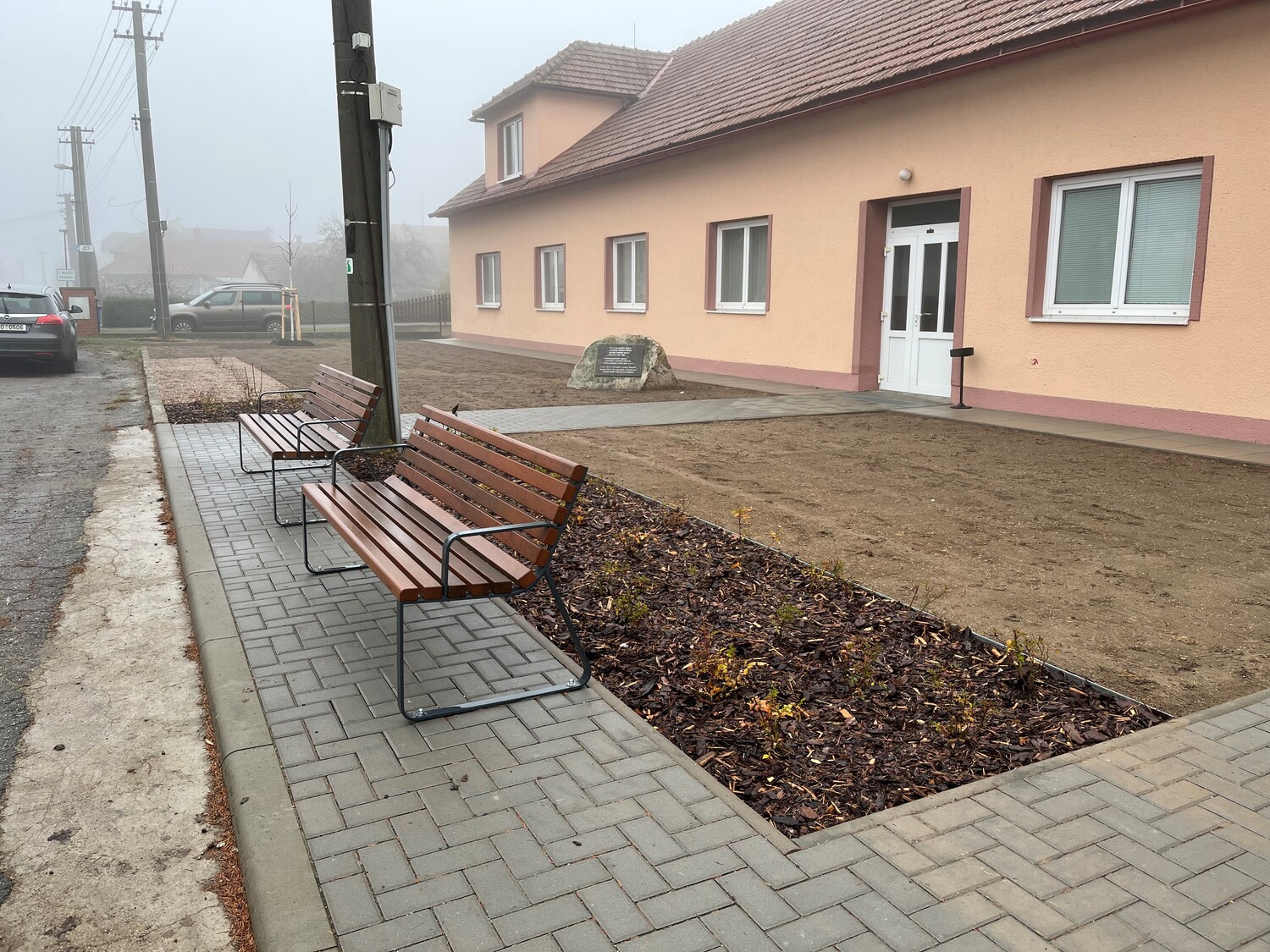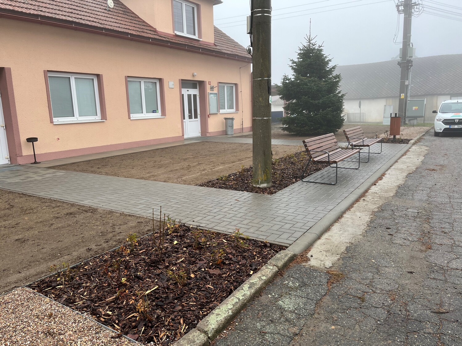 Prostor před kulturním domem v Hrbově je osázen růžemi, šeříky a tavolníky, které spolu s novými chodníky zkrášlí prostor.