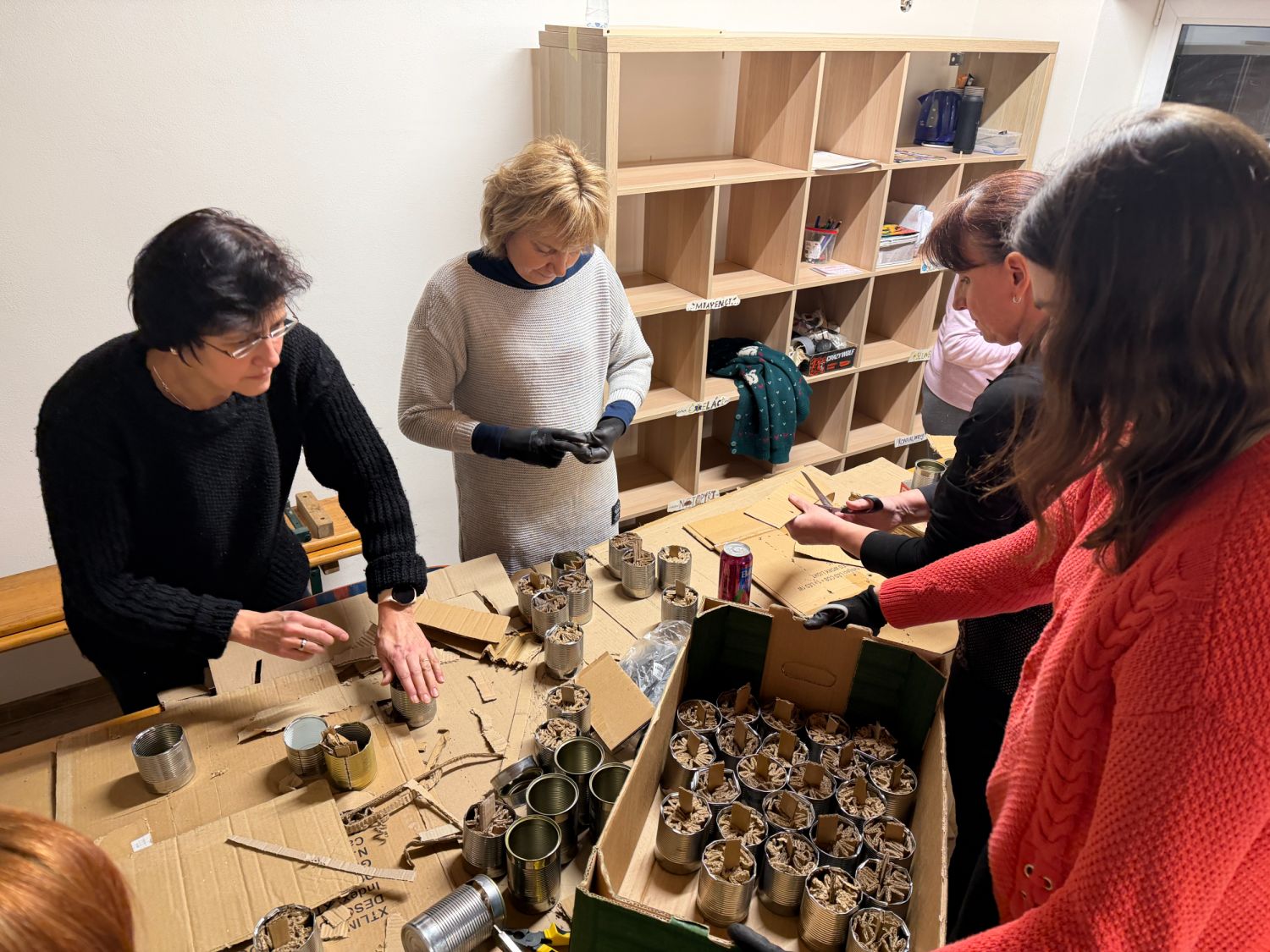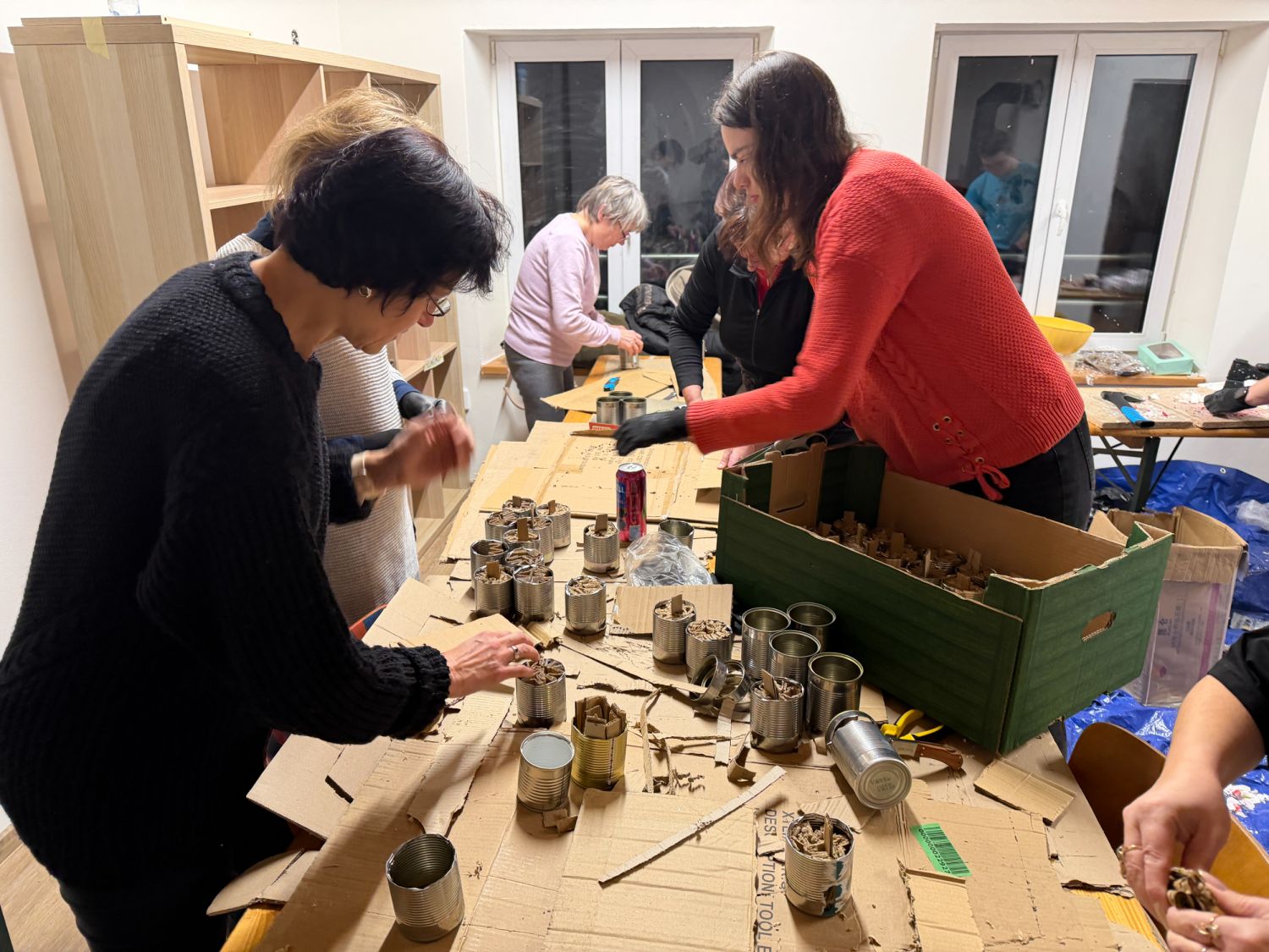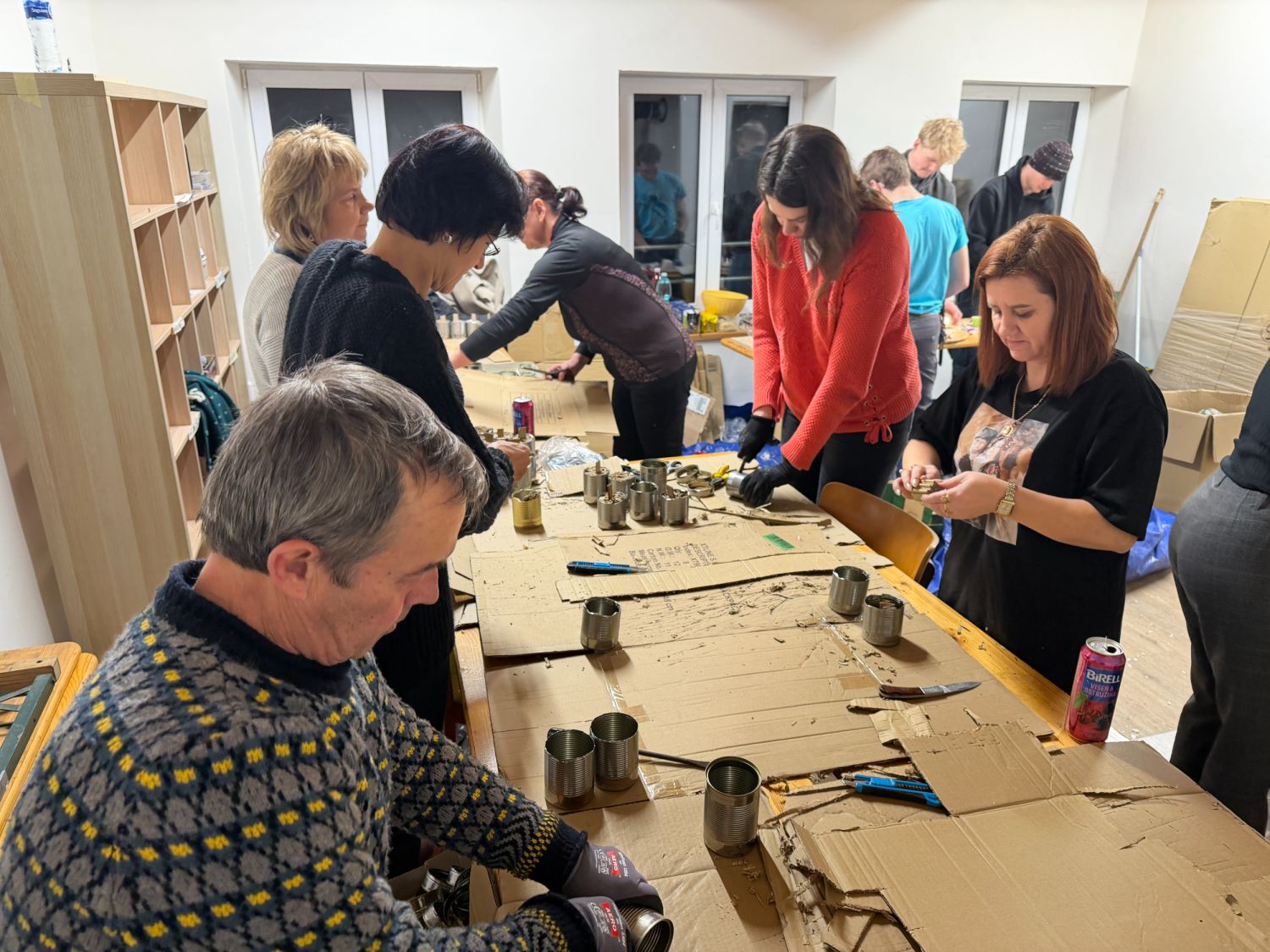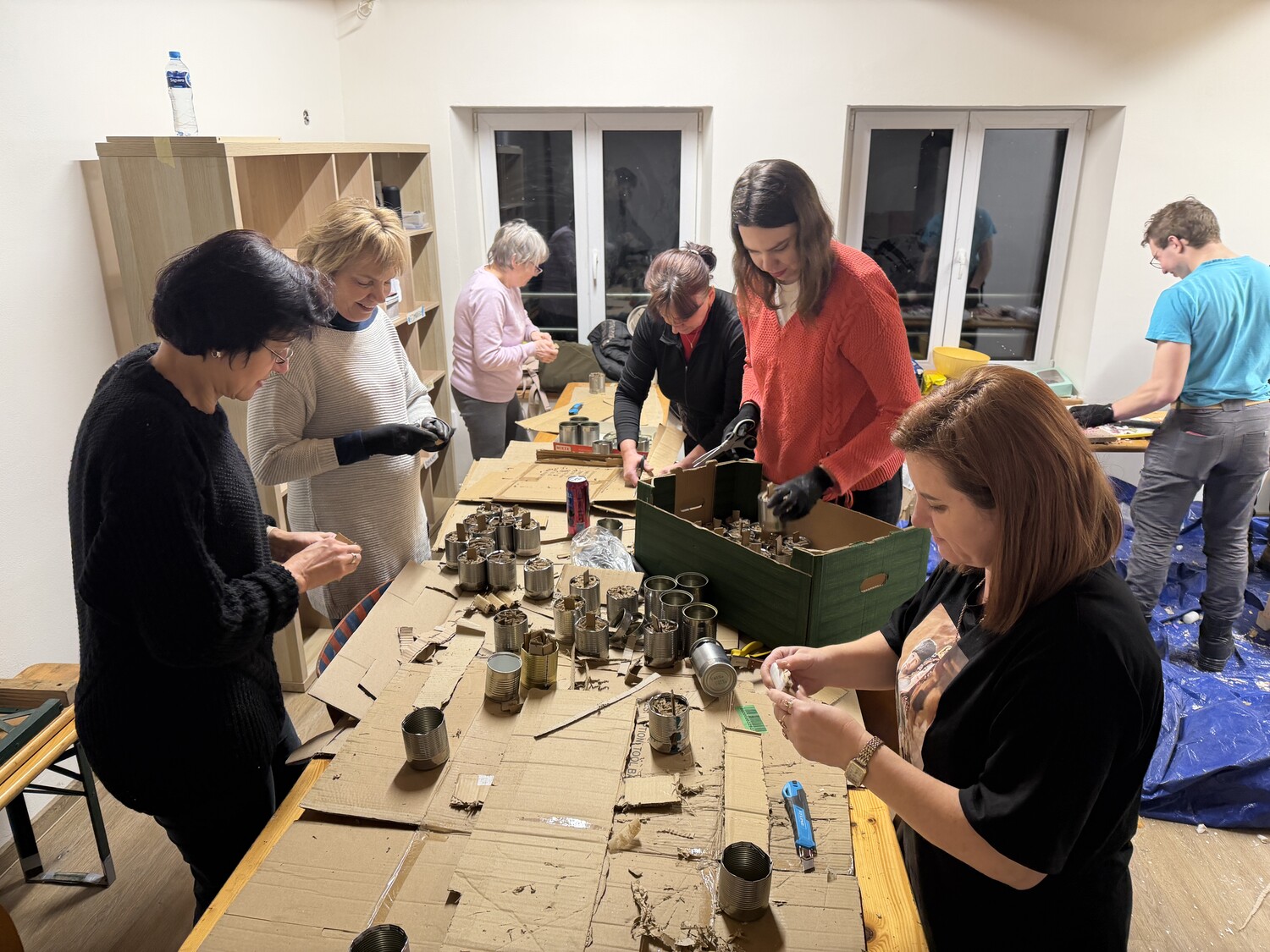 Během večera se sešlo asi 20 účastníků, kteří pracovali na výrobě svíček putujících lidem zasaženým válkou na Ukrajině. Dobrovolníci stříhali a skládali kartonové vložky, připravovali vosk, upravovali plechovky a následně je plnili kartonem a roztaveným voskem.