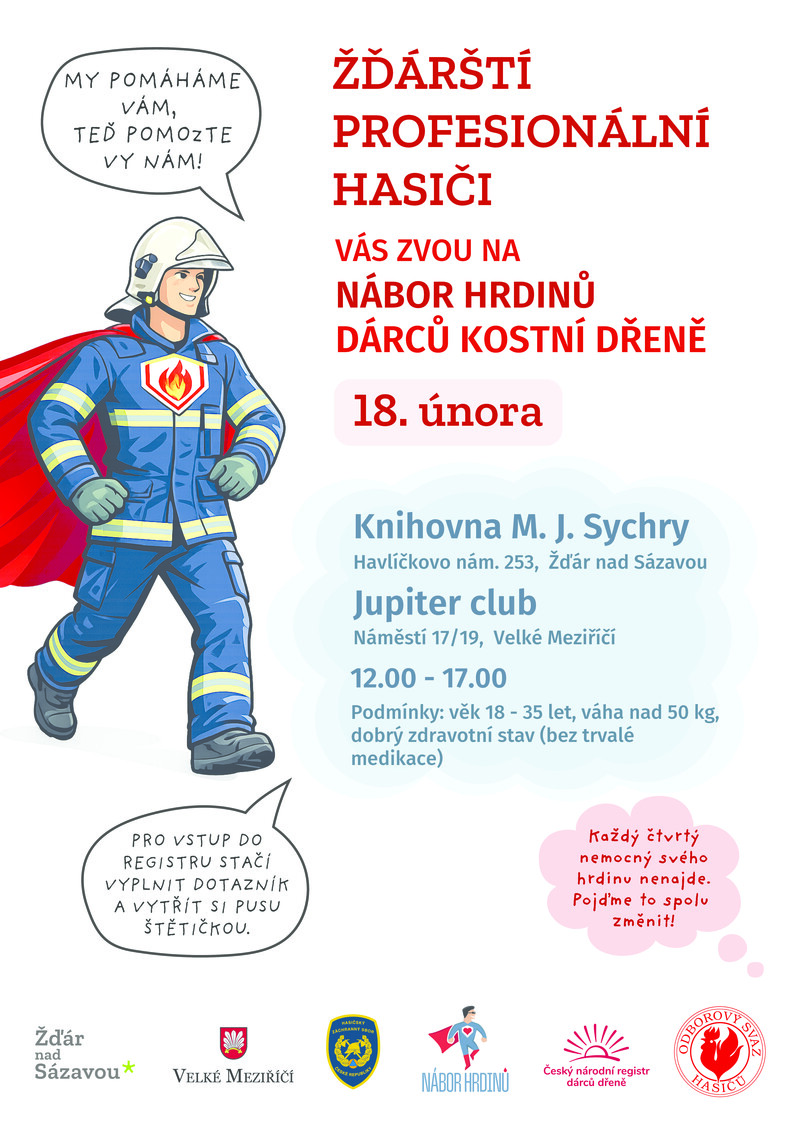 Profesionální hasiči ze Žďáru nad Sázavou, město Žďár společně s Velkým Meziříčím, Český národní registr dárců dřeně, Nábor hrdinů a Odborový svaz hasičů připravili veřejný nábor do registru dárců kostní dřeně. Impuls přišel od profesionálních hasičů, kteří nedávno zorganizovali nábor mezi kolegy a policií pro onkologicky nemocného kolegu. Dorazila stovka lidí. Teď chtějí dát šanci pomoci i veřejnosti.