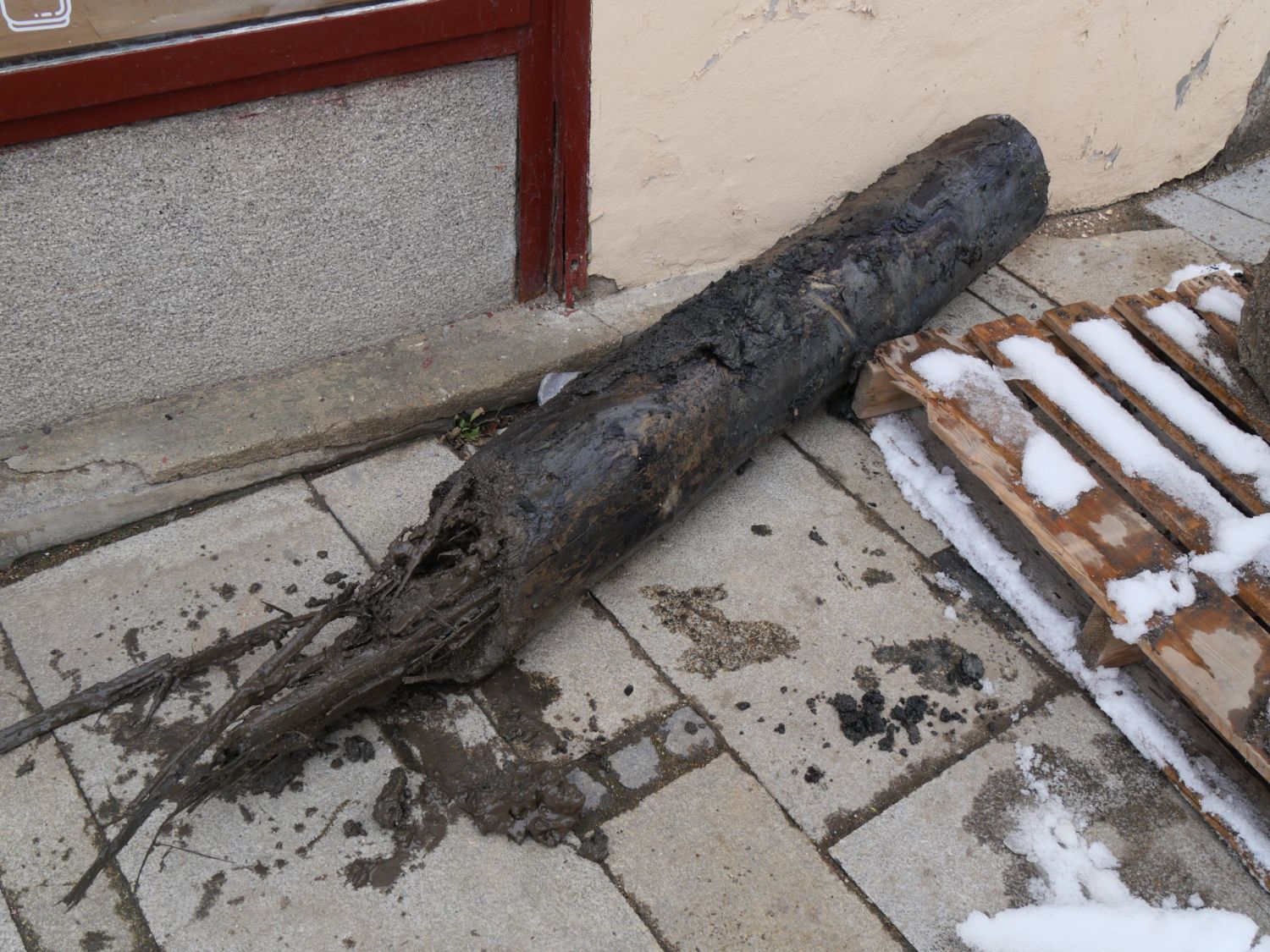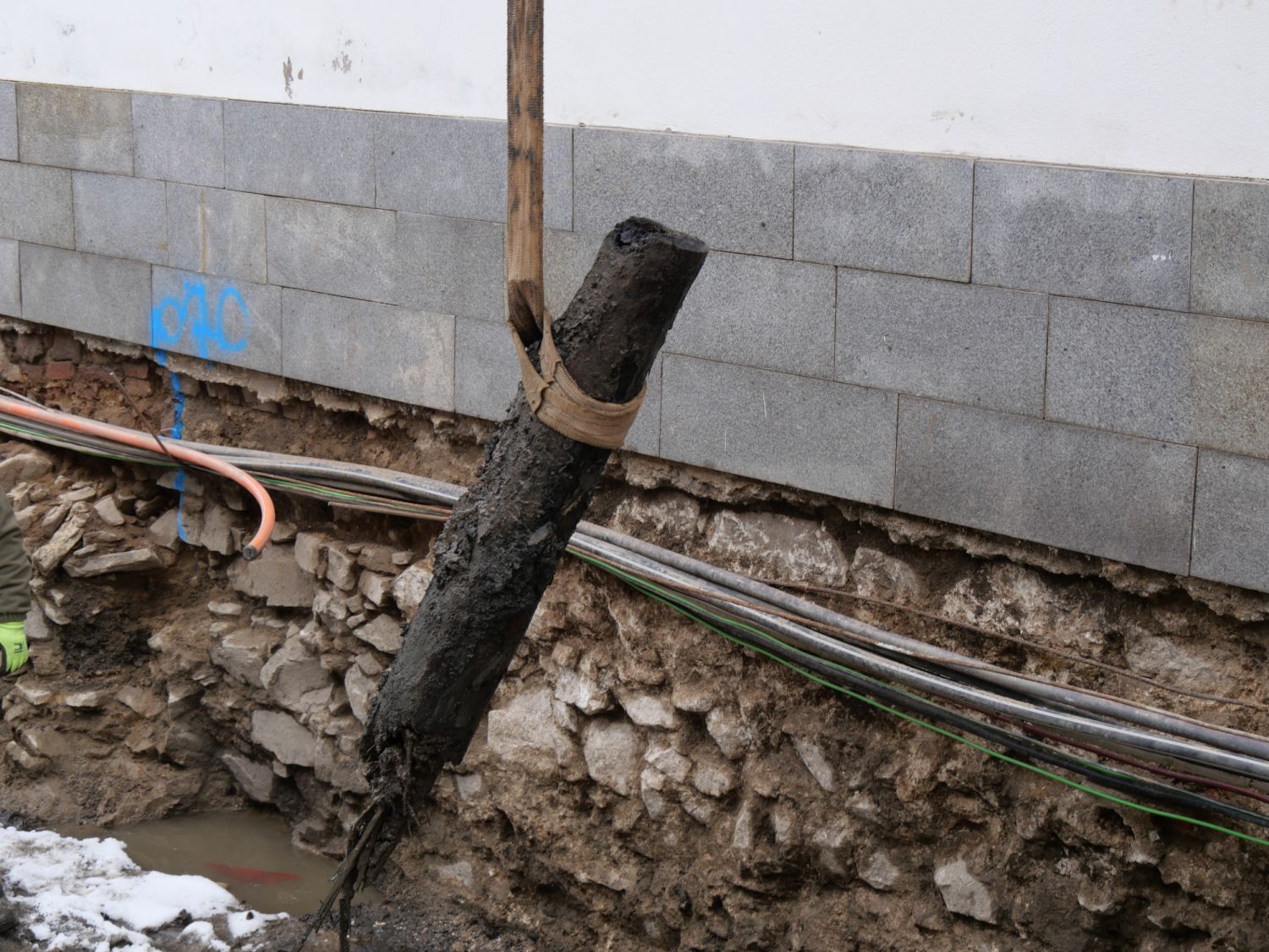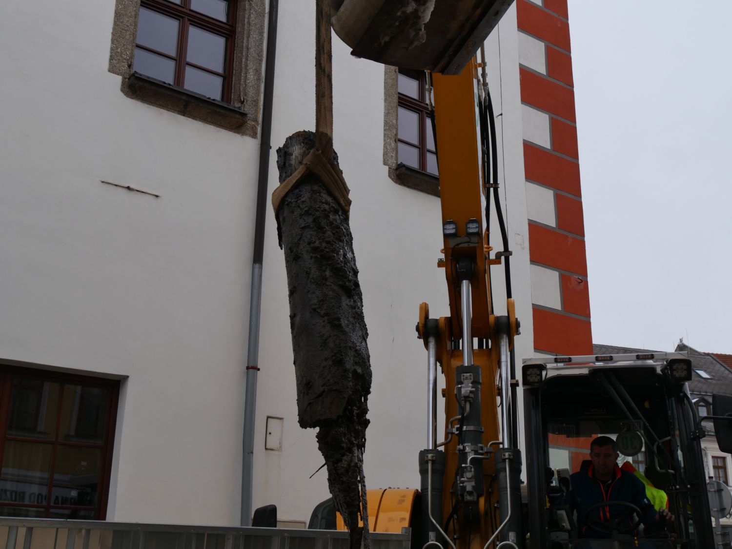 Ve stejný den také z výkopu u radnice vytáhli dřevěnou trubku barokního vodovodu (o objevu vodovodu jsme informovali včera).