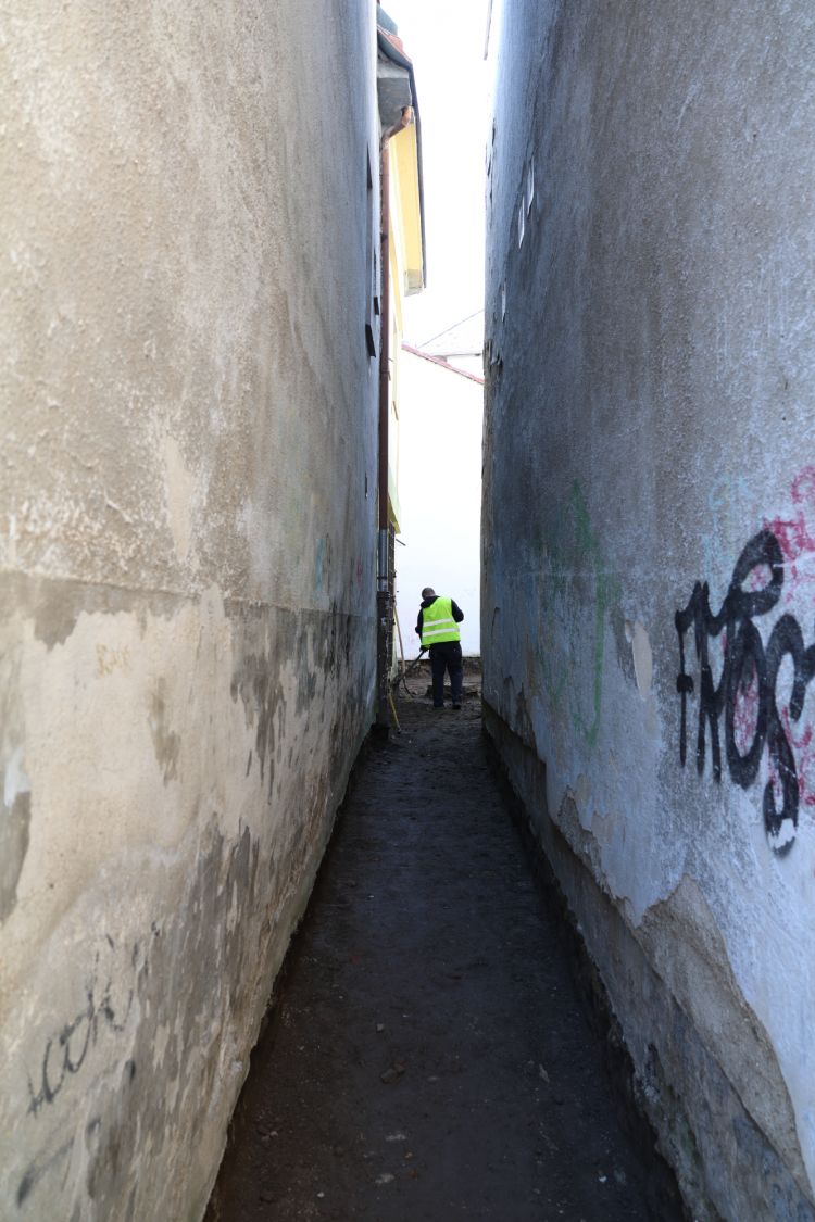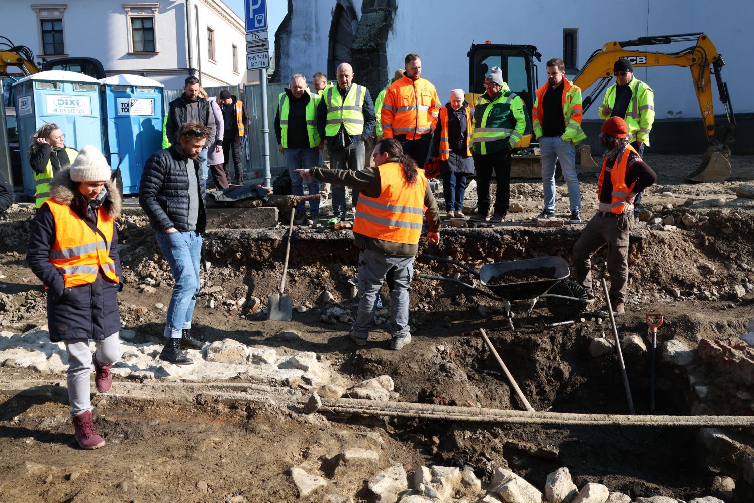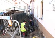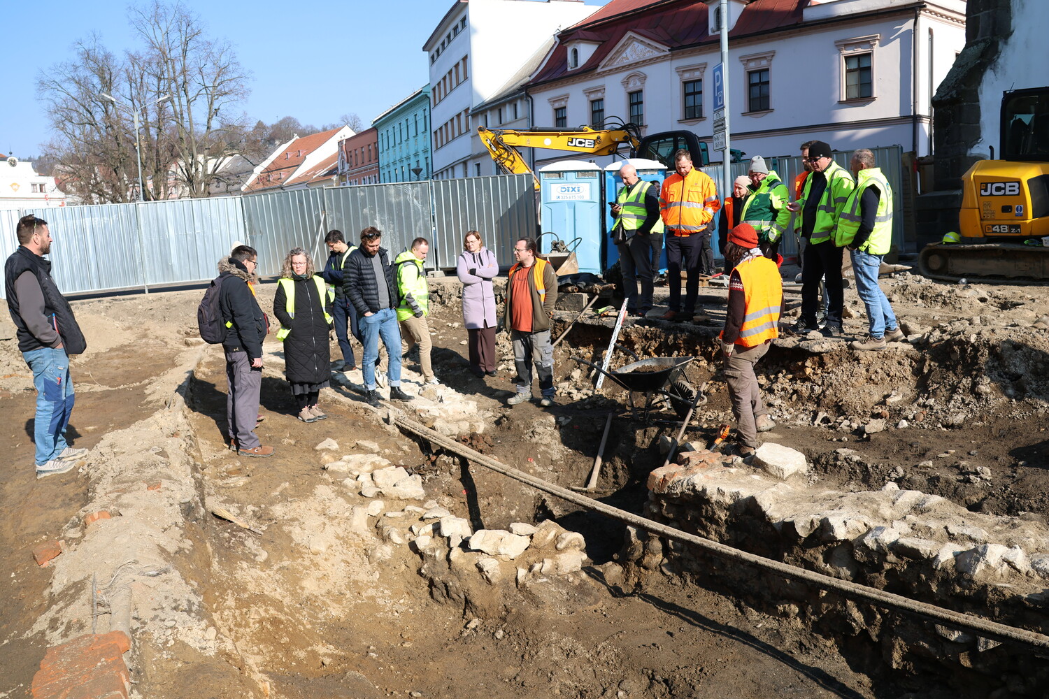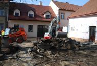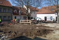 Plné ruce práce mají i archeologové. Stavební firma jim v předstihu odkryla plochu v místě budoucího vsakovacího objektu u kostela, kde provedli výzkum. Odkryli pokračování hřbitovní zdi i do ní vsazenou jímku na vodu. Průzkum byl včera dokončen a dnes již firma zahájila hloubení jámy pro vsakování. Záchranný archeologický výzkum nyní bude pokračovat vedle kašny, kde se nacházejí základy pranýře, pece a středověká studna, a také v novém výkopu pro akumulační nádrž.