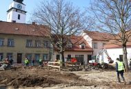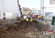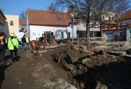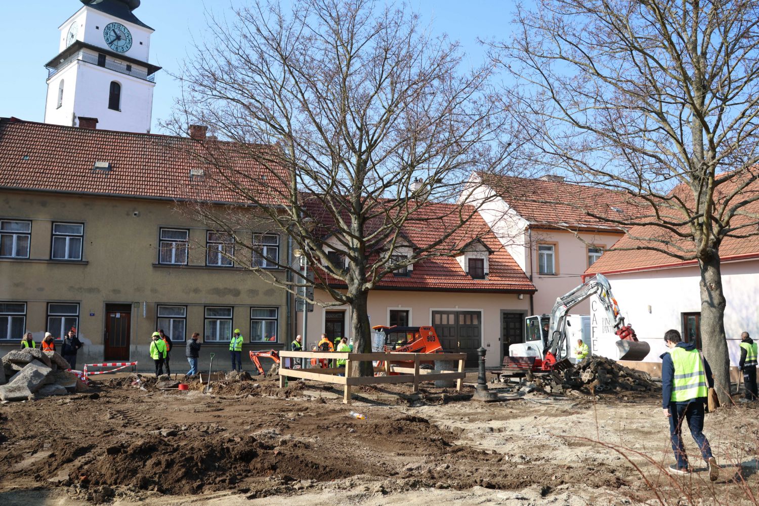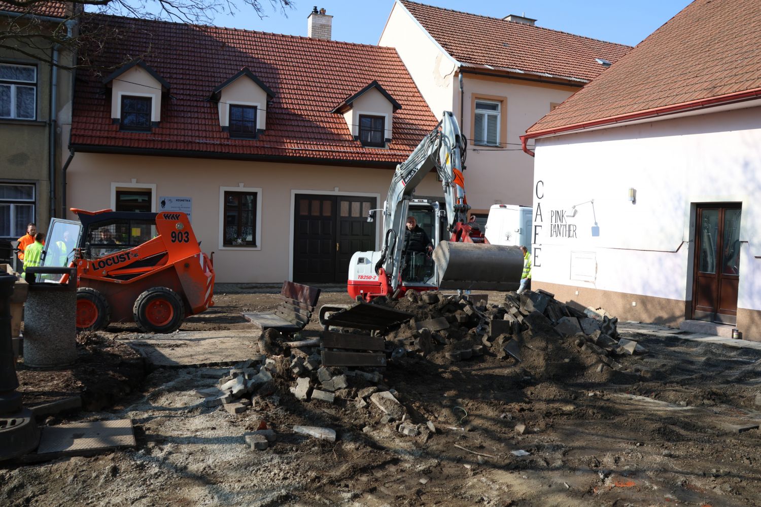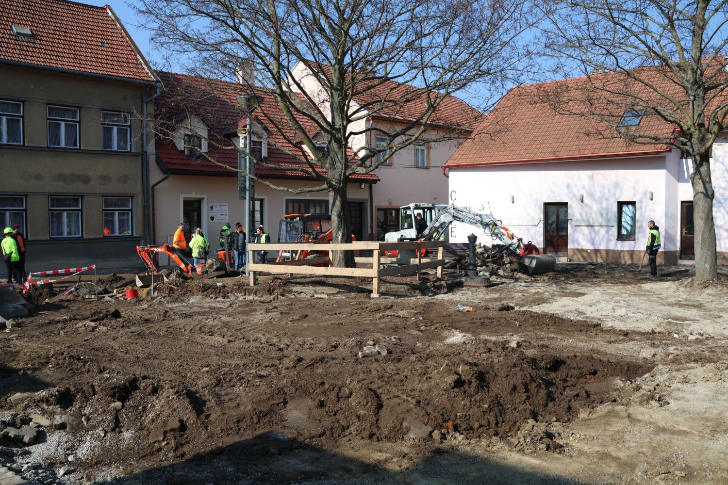 Na spodní části náměstí dokončují stavebníci poslední metry kanalizace. V průběhu března je vystřídají plynaři a zhruba o týden později také elektrikáři. Kompletní uložení sítí a přípojek do země by zde mělo být hotové v dubnu. Následovat bude pokládka dlažby na chodnících a po dokončení plynárenských prací i na vozovce.