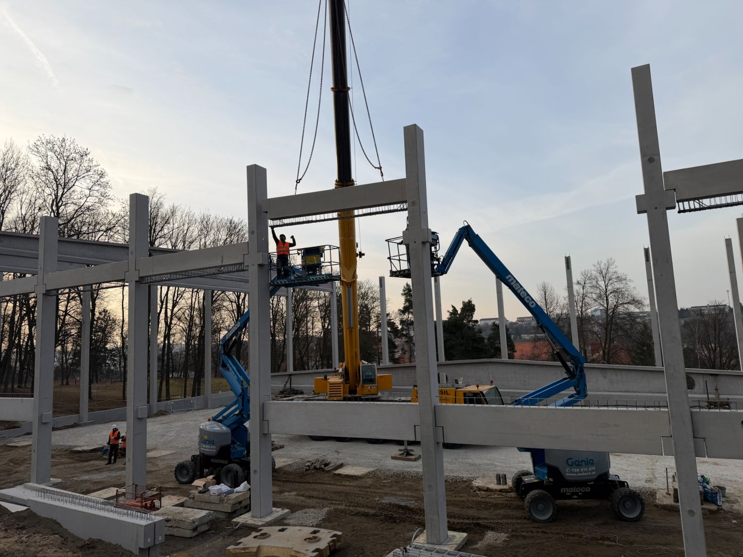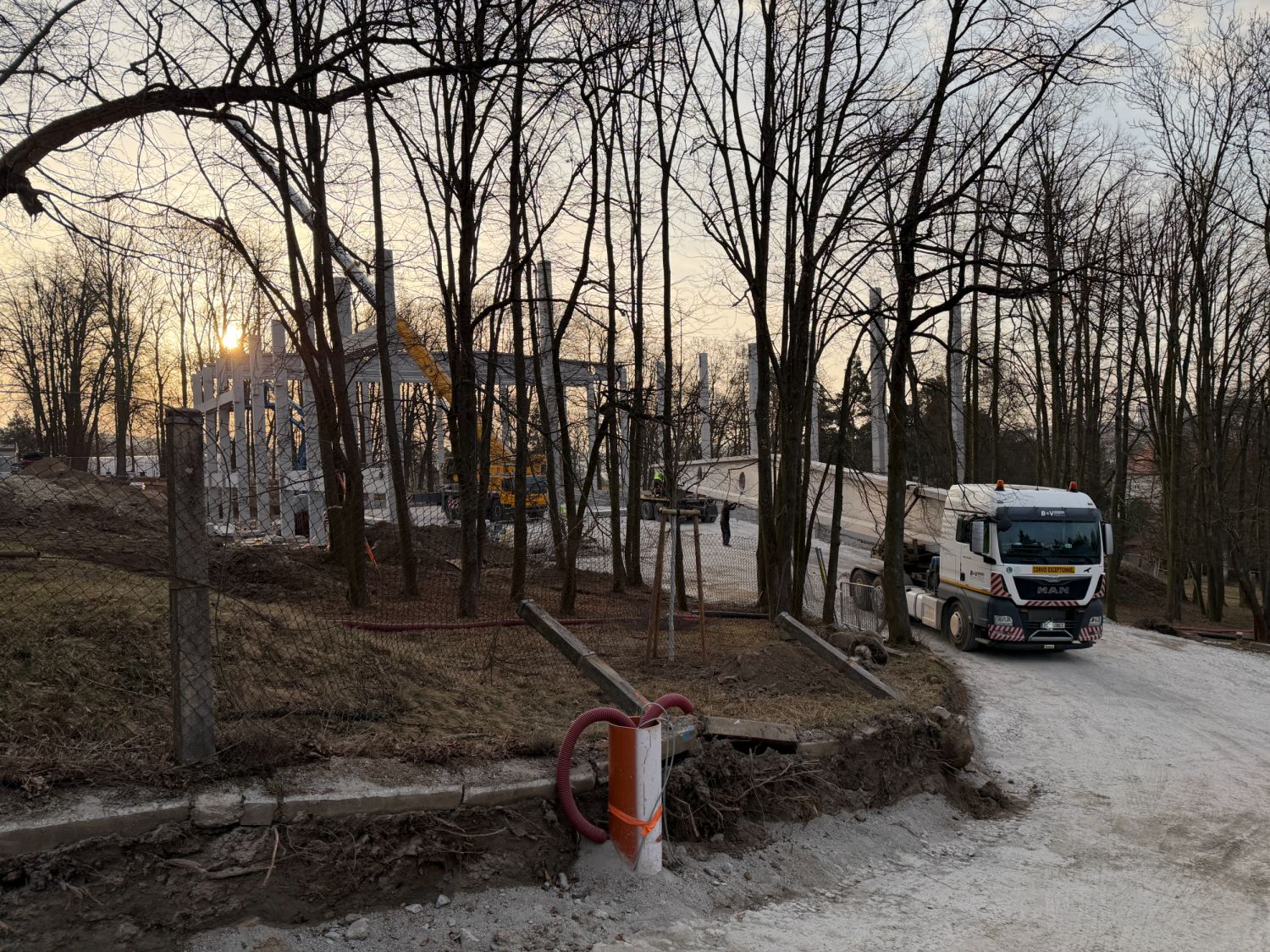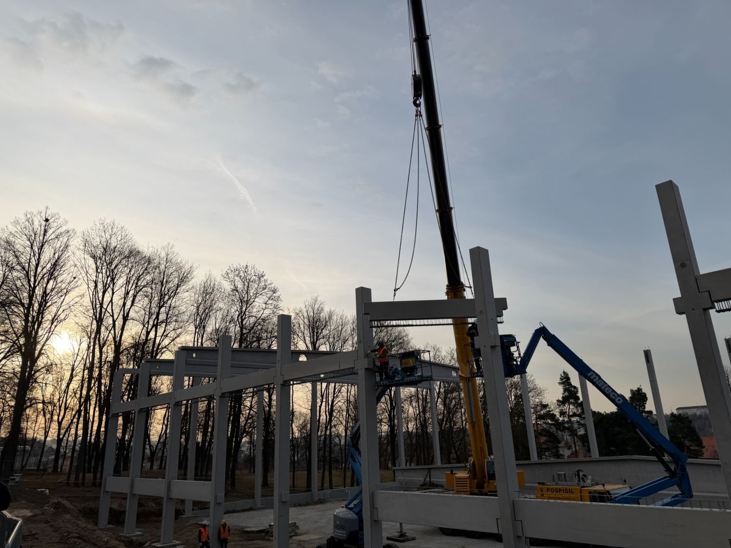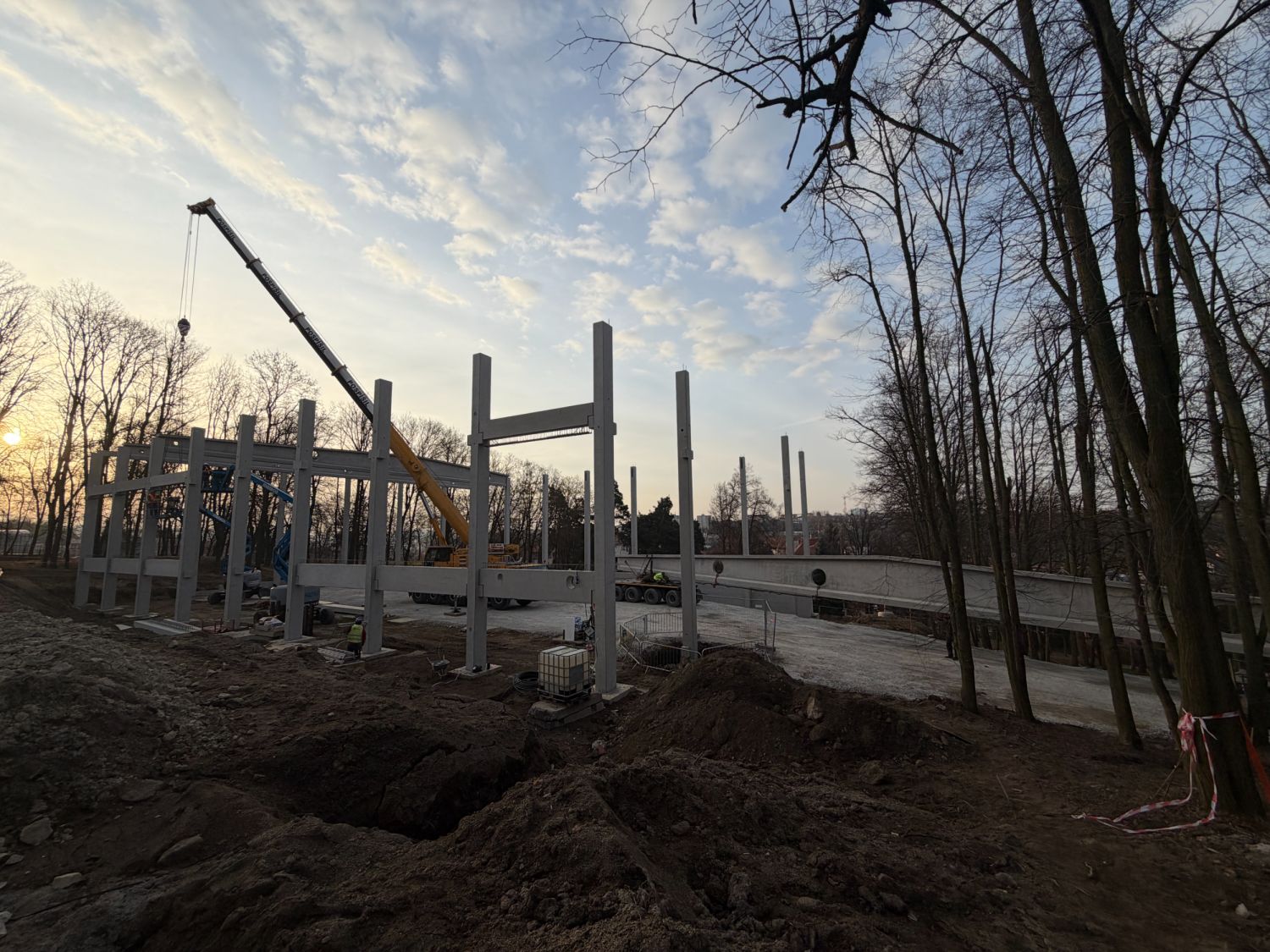 Na staveniště nyní přijíždějí velké železobetonové vazníky a další konstrukční dílce, které jeřáb okamžitě usazuje na své místo. Doprava dlouhých betonových prvků však není jednoduchá – v ulici U Světlé musí řidiči s rozměrným nákladem manévrovat doslova na centimetry.