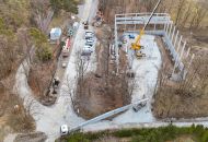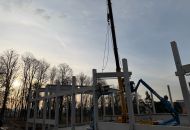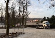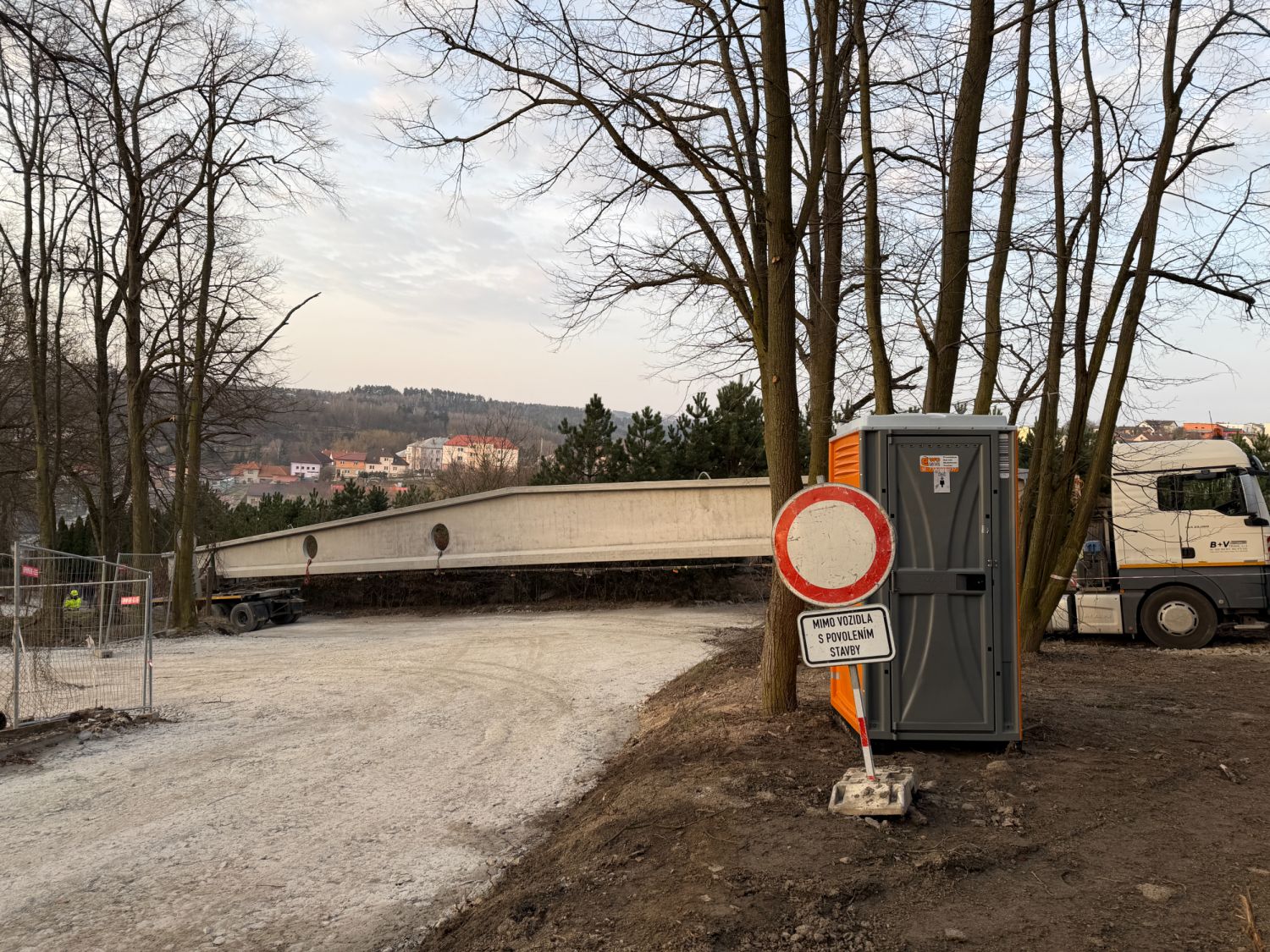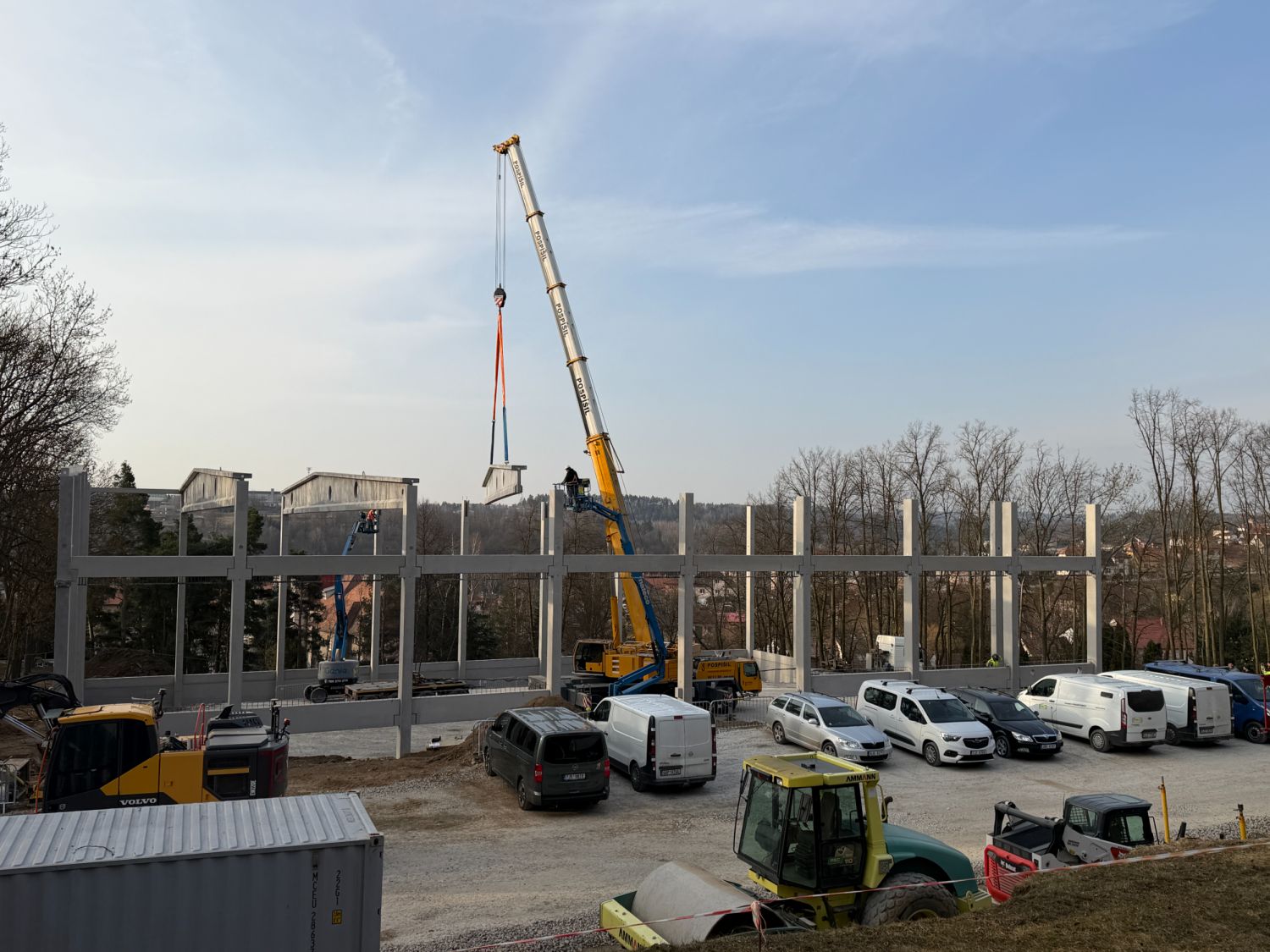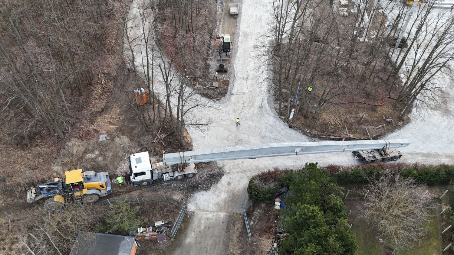 Na staveniště nyní přijíždějí velké železobetonové vazníky a další konstrukční dílce, které jeřáb okamžitě usazuje na své místo. Doprava dlouhých betonových prvků však není jednoduchá – v ulici U Světlé musí řidiči s rozměrným nákladem manévrovat doslova na centimetry.