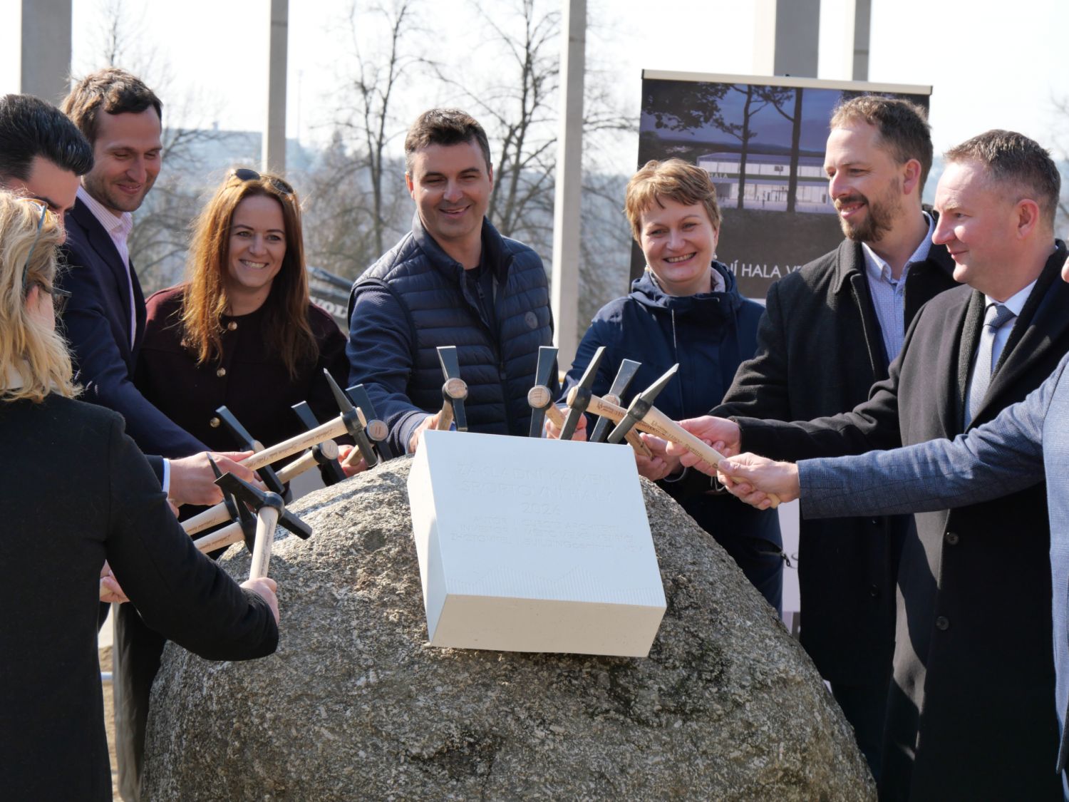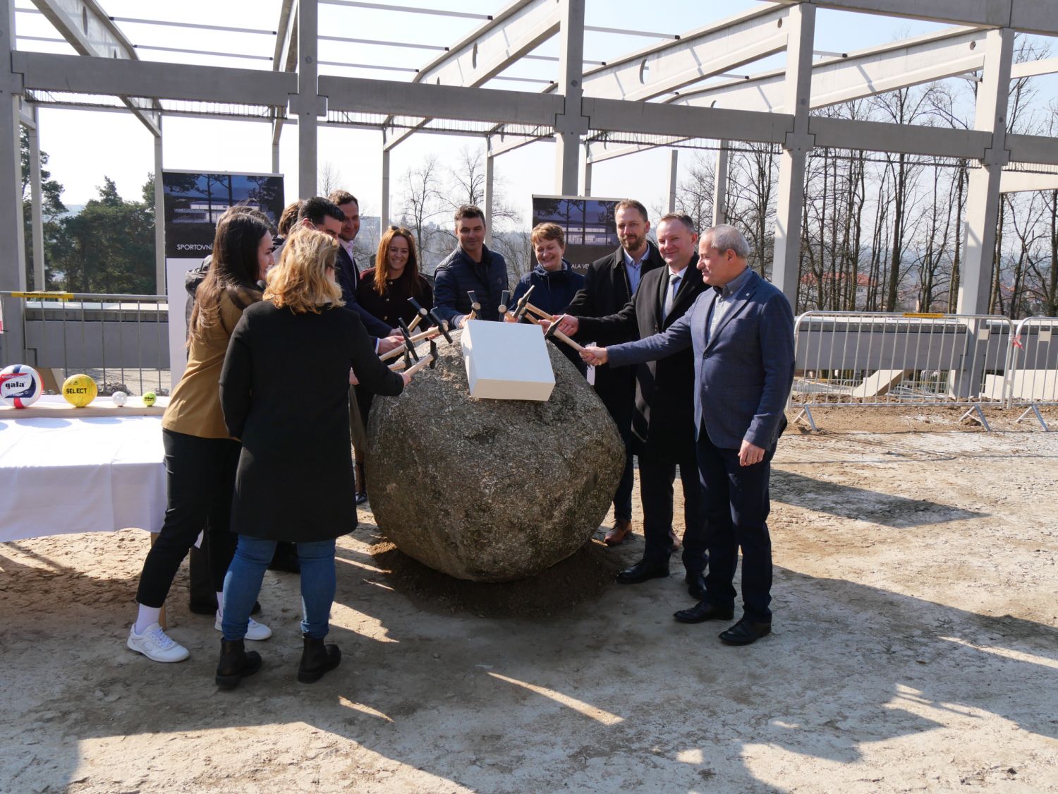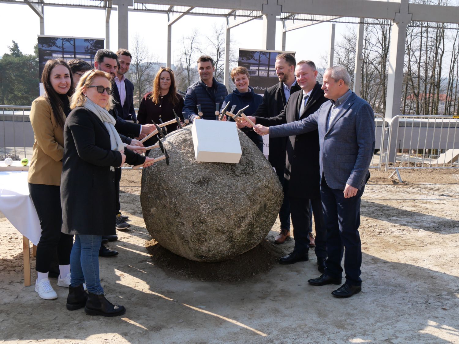 Pak už došlo na samotné poklepání základního kamene s pamětní deskou a na stavbě se znovu rozvinul čilý pracovní ruch. Stavba haly má být dokončena v polovině příštího roku.