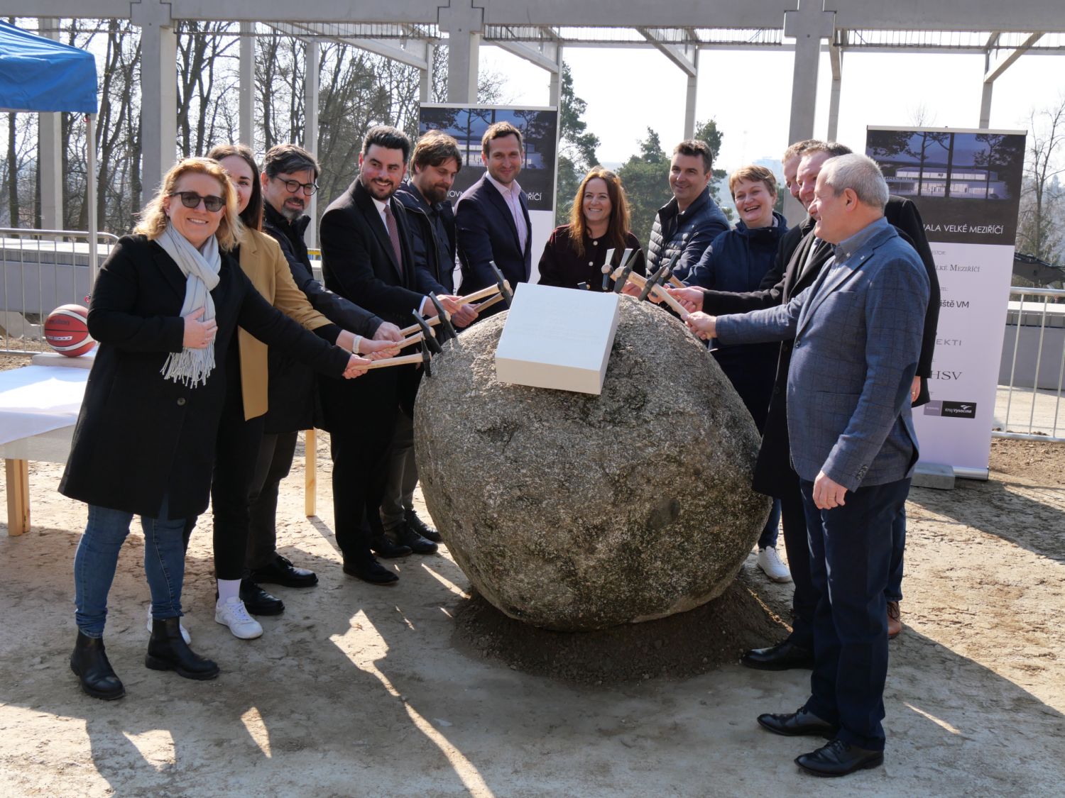 Už před desátou hodinou dopolední se na stavbu sjížděli vzácní hosté, které na místě přivítal starosta Velkého Meziříčí Alexandros Kaminaras spolu s místostarostou Martinem Kamanem. Na slavnostní poklepání základního kamene dorazili hejtman Kraje Vysočina Martin Kukla, za Národní sportovní agenturu Ivo Jebousek, ředitel Sportovišť VM Michal Hořínek, ředitelka Ga-Te Petra Tomanová, za zhotovitele stavby společnost Building Centrum – HSV Karel Věžník a v neposlední řadě autoři návrhu nové haly z ateliéru CUBOID architekti Aleš Papp, Magdaléna Pappová a Eliška Drbalová. Nechyběli ani radní a zastupitelé města, a také zástupci sportovních oddílů, které se nové haly už nemohou dočkat.
