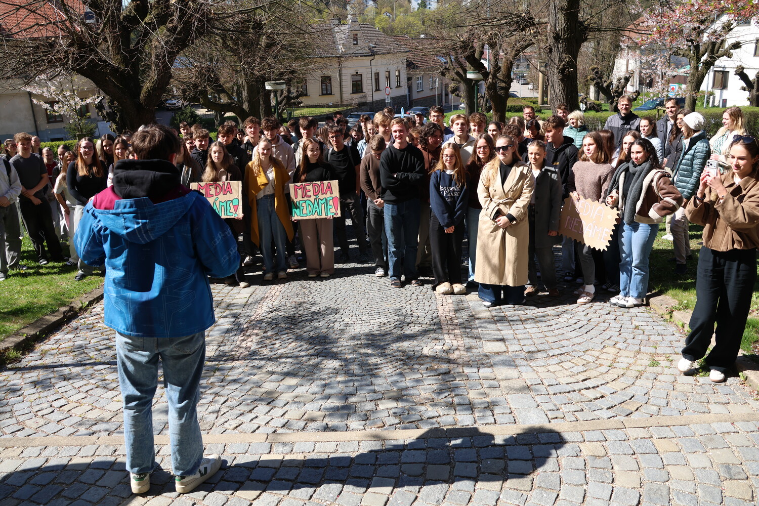 Studenti, učitelé a veřejnost se dnes o velké přestávce sešli před budovou gymnázia, aby vyzvali vládu ke stažení návrhu zákona o médiích veřejné služby.
