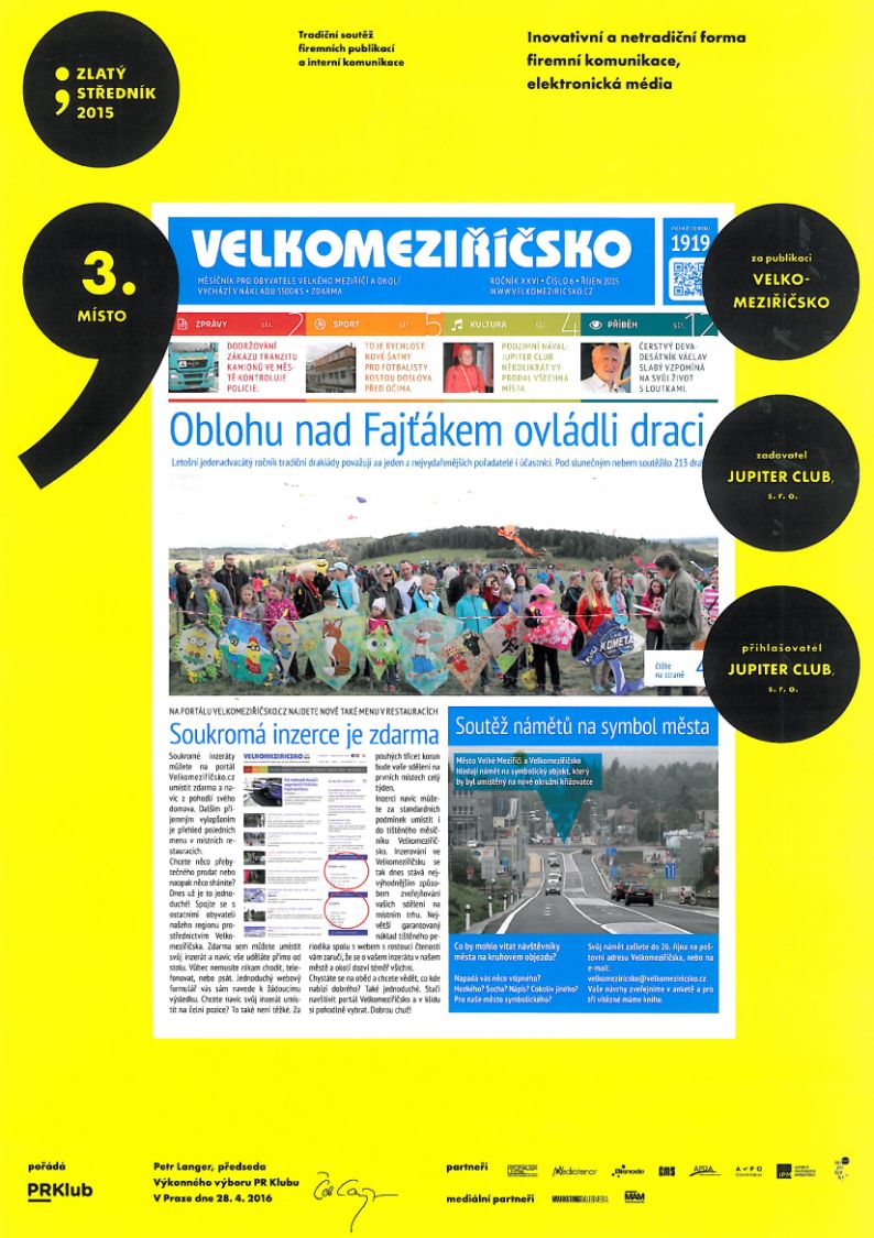 Nové Velkomeziříčsko dostalo k prvnímu výročí své existence mimořádně hodnotný dárek. V nejprestižnější profesní soutěži Zlatý středník se v kategorii Inovativní a netradiční forma firemní komunikace, elektronická média umístilo na 3. příčce. Zároveň bylo mezi čtyřmi nominanty na cenu Grand Prix – celková úroveň, elektronická. Soutěže se letos účastnilo 127 médií a periodik.