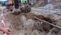 Firma, která v ulici Nad Tratí provádí přeložku plynu, se musí potýkat s mimořádně tvrdým podložím. Přesto dosud harmonogram dodržuje a avizovaný zářijový termín dokončení prací není ohrožen.