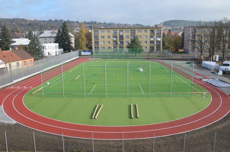 Víceúčelové hřiště za gymnáziem je v podstatě dokončeno. Zbývá ještě doplnit písek do umělé trávy a vyset přírodní trávu do volných okolních ploch.